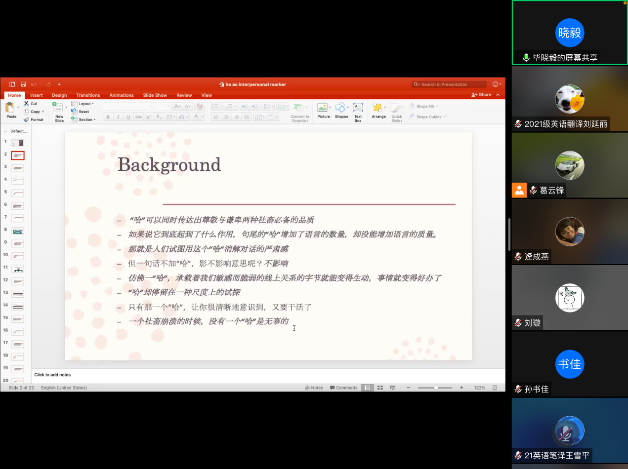 毕晓毅老师的发言题目是“网络汉语微信中‘哈’的人际语用标记”。毕老师提到,汉语中的 “哈”不仅可以执行构象和惊喜等语言功能,而且在会话交流中能够传达很多人际语用意义,尽管“哈”的使用非常频繁,但是很少有学者系统地研究其使用方法。毕老师通过搜集个人聊天记录,发现说话者从表达积极情绪信息的原意出发,使用 “哈”作为不同类型的融洽取向交流方式,进行积极的自我表达。此研究结果体现了中国社会文化价值观的变化。