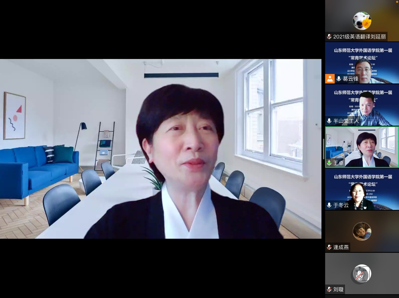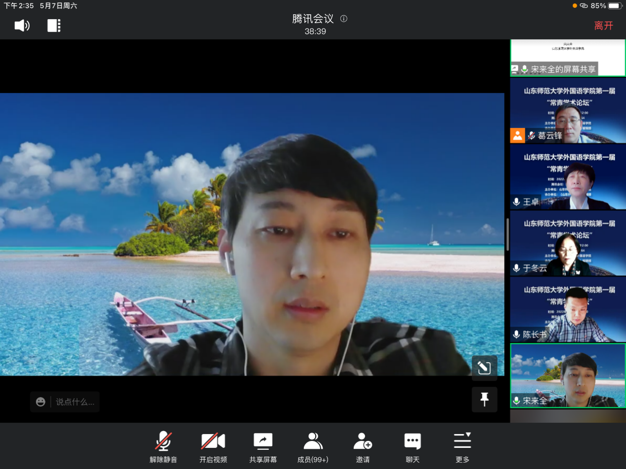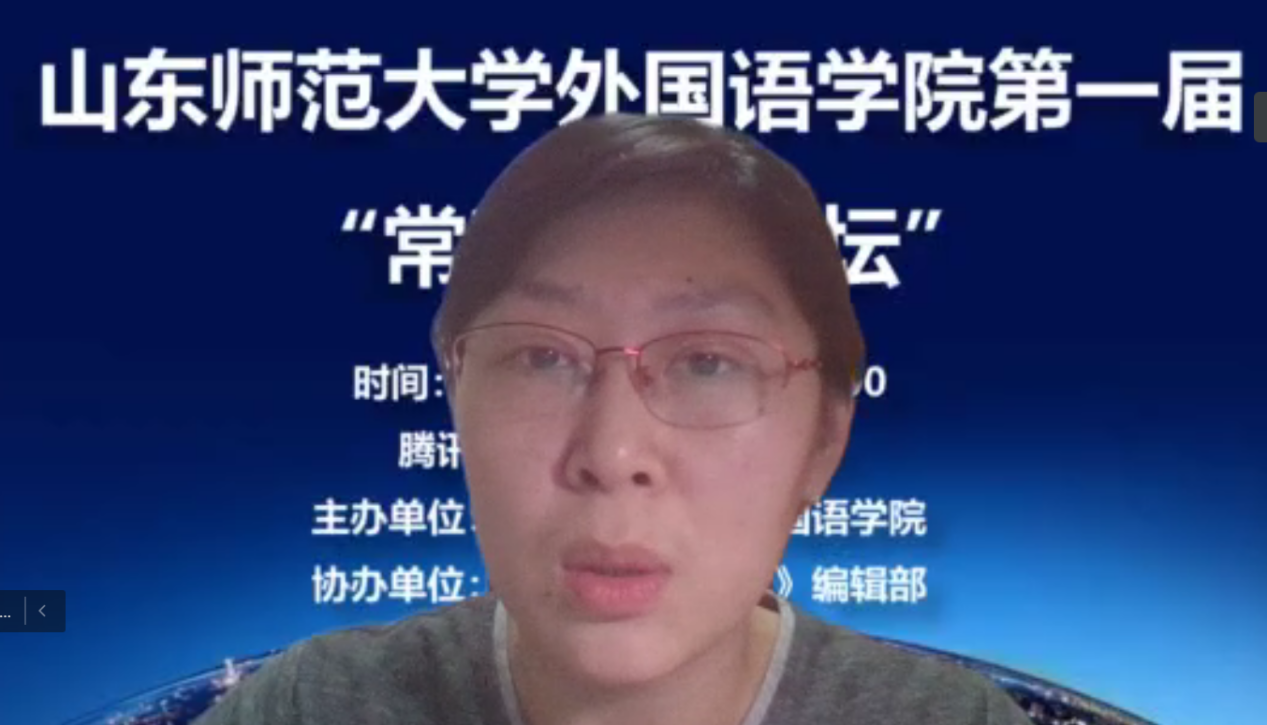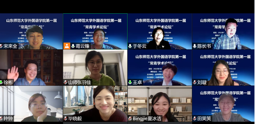 5月7日下午,外国语学院第一届“常青学术论坛”于腾讯会议在线平台成功举办。本次论坛由山东师范大学外国语学院主办,《山东外语教学》编辑部协办。外国语学院的徐彬教授以及青年骨干教师钟洁、宋来全、毕晓毅、夏冰洁、田笑笑、刘璇、张羽佳共八位老师做了主题发言。本次论坛由外国语学院院长王卓教授、山东师范大学文学院于冬云教授、陈长书教授、外国语学院徐彬教授担任点评专家。论坛由外国语学院副院长葛云锋教授主持,外国语学院部分教师、全体研究生和部分本科生聆听了本次论坛。