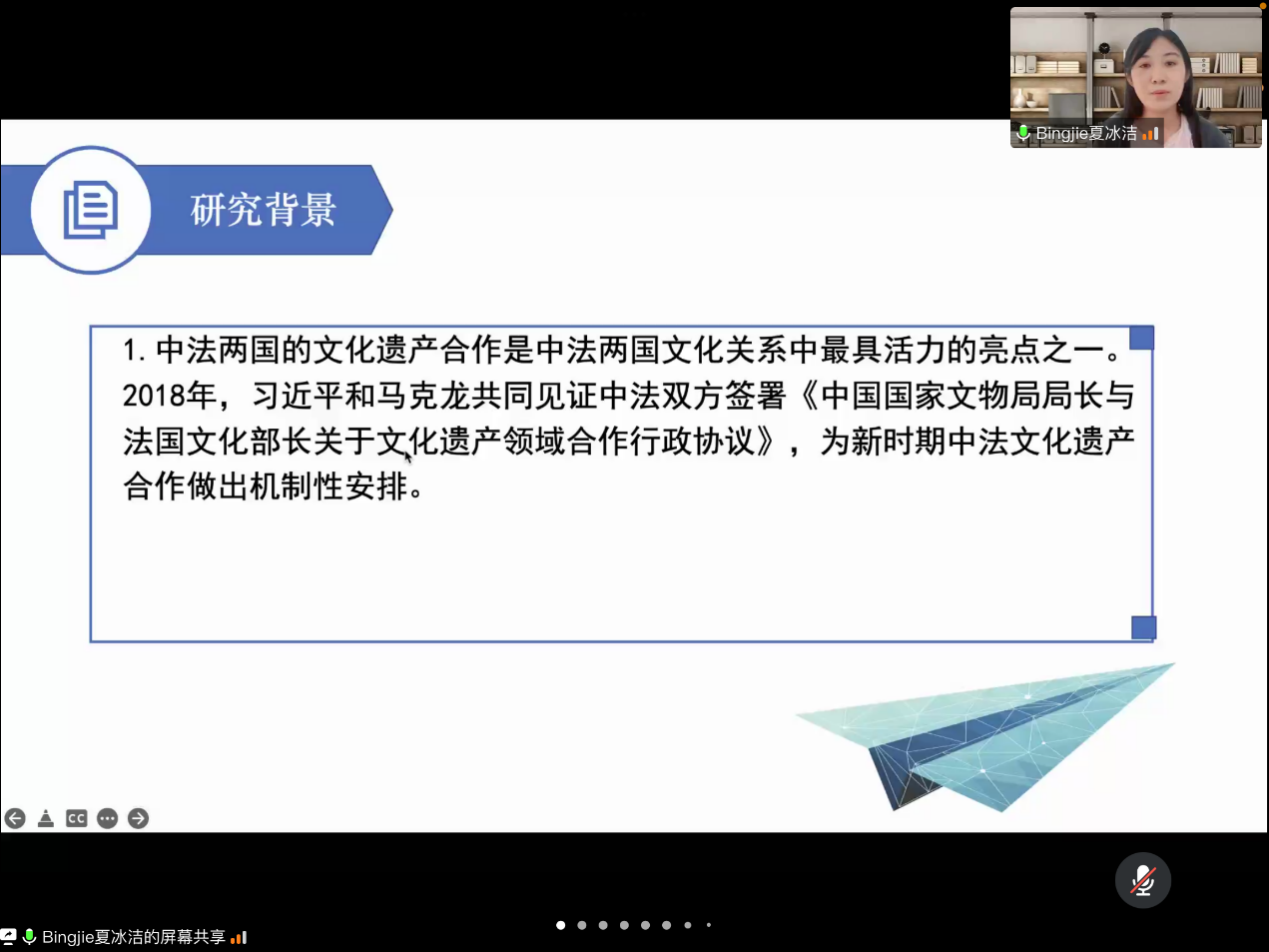 夏冰洁老师分享了题为“中法非物质文化遗产保护比较研究”的研究课题。该研究旨在建立基于地域经验的中法非物质文化遗产比较研究体系,汲取国外优秀经验,对山东省非物质文化遗产的海外传播路径提供建议。此外,夏老师通过个例研究,对非物质文化遗产的类型、保护管理机构、保护与传承措施三方面进行比较。