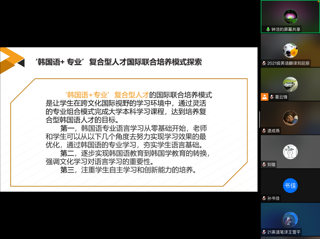 钟洁老师的发言题目是“新文科背景下‘韩国语+专业’复合型人才国际联合培养模式探究”。钟洁老师指出,随着全球经济一体化的不断深入,社会对跨学科复合型外语人才的需求日益凸显。但近几年韩国语教育普遍出现了招生难、就业难的问题,部分学校的韩国语专业甚至面临停招的困难。因此,如何建构有效的韩国语人才培养模式已成为亟待解决的问题。对此,钟洁老师提出了“韩国语+专业”的国际联合培养模式,即学习国外高校教学改革的成功经验,充分整合国内外优秀教育资源,培养具有国际视野、知识面广、具备使用韩国语和专业知识解决问题的高素质的复合型人才。钟洁老师认为该模式契合社会和企事业单位对复合型人才的需求,能够为韩国语教育的长足发展提供行之有效的途径。