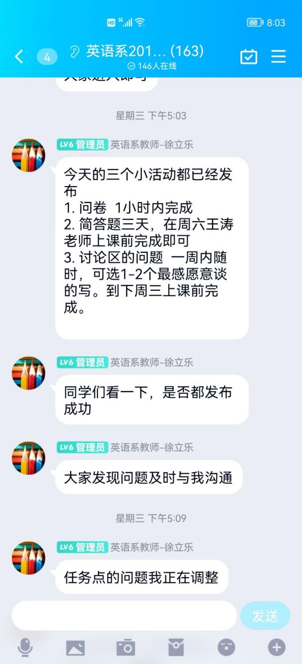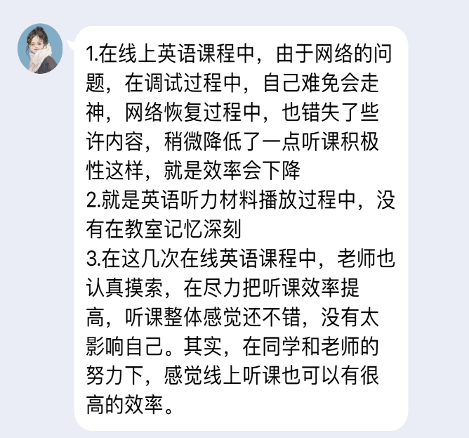 在本次线上授课过程中,因学生们不定时参加核酸抽检,可能会导致无法按时进入课堂的情况。大外部任课老师们借助教学平台设定课程回放,保证学生们能够随时完成课堂学习内容。同时任课老师们还通过qq群实时在线答疑,保证学生们的问题有响应,有回复。在线课程结束后,任课老师们第一时间收集学生们的反馈,反思授课情况,着手解决问题,以实现线上教学的不断进步。