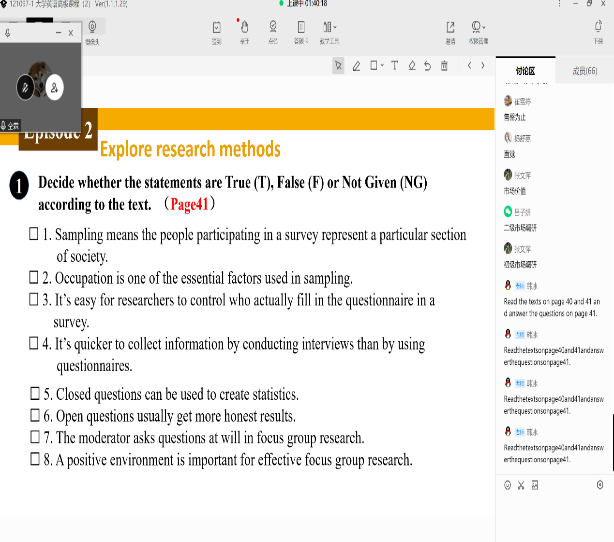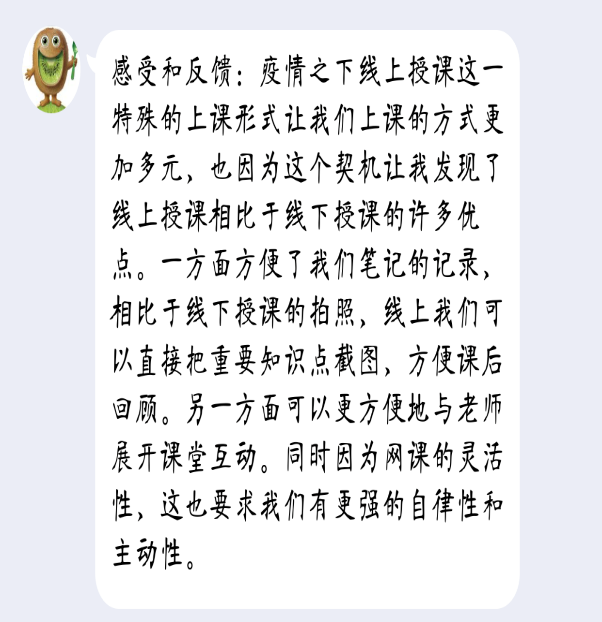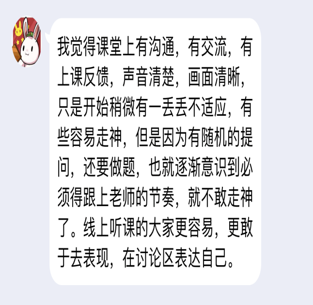 由于部分同学在之前的疫情封控期已经有过线上网课学习的经验,本次疫情的线上教学,学生普遍适应良好。网课过程中学生学习依旧保持较强的主动性和较高的学习热情,学生会提前准备教师要求预习的内容,按时进入腾讯会议。疫情虽然阻隔了教师和学生的面对面互动,但师生之间并不会因此疏远。线上学习平台支持通过连麦、视频、分组讨论、实时提问、互动批注、个人笔记等多样化的互动学习方式,也能够达到很好的学习效果。课后学生也提问踊跃,及时提交教师布置的作业。除了个别学生会出现卡顿或者耳机出问题的情况外,总体运转良好。