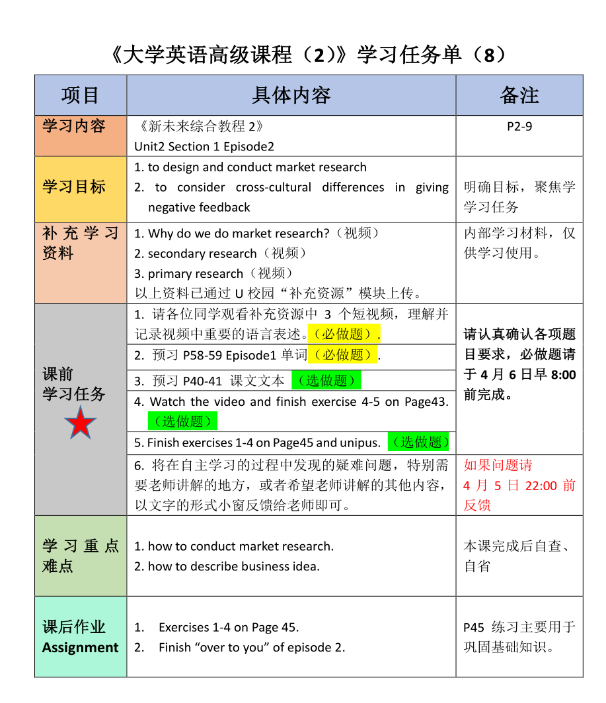 线上教学的开启使师生面对面接触的时间减少,学生在学习过程中有些困惑和迷茫。大学英语任课教师们根据学生们的语言水平,授课内容、学习习惯等提前做好规划,课前为学生们发布《学习任务单》,明晰每节课学习重点、难点,课前需要完成的学习任务,课上要检查的内容等,使学生们的学习做到“有的放矢”。线上授课过程中,任课教师随机检查课前预习情况,着重强调语言重点难点等,也使学生们能够认真关注线上学习的全过程。图片、视频、音频等辅助教学资料的使用增加了课程的趣味性,保证线上教学的“吸引力”。