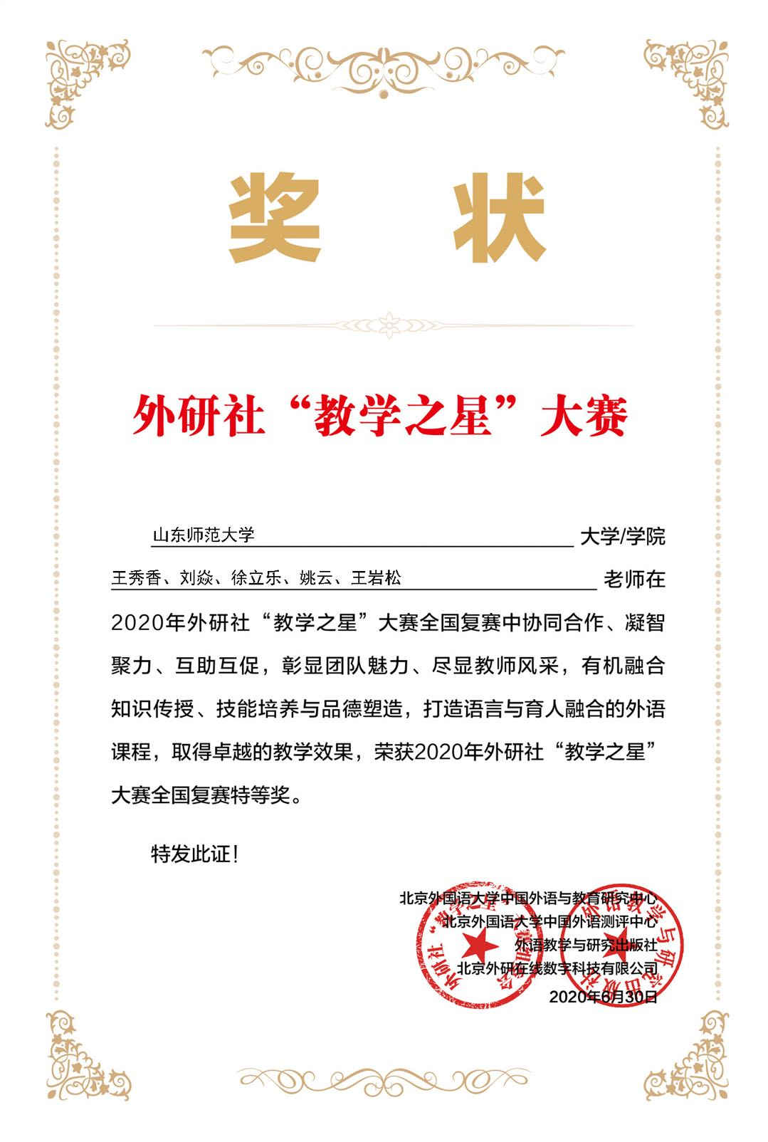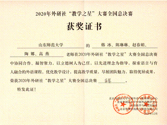 外国语学院积极鼓励教师参加教学比赛,提升理论素养,磨练教学技能。学院每年组织青年教师教学能手比赛,赛前重部署,聘请有经验的教师进行辅导;赛后会将相关评委的点评意见和建议汇总反馈。同时,对于能够进入校级或更高层次教学能手比赛的教师,学院积极创造条件,帮助教师进行赛前准备,并提供必要的软硬件保障。近年来,学院一批青年教师在竞赛中脱颖而出。如,2018年6月,我院青年教师韩冰在山东省第五届“超星杯”高校青年教师教学比赛中经过激烈角逐,喜获大赛二等奖;2020年8月,大学英语及英语专业两支教学团队在外研社“教学之星”大赛全国半决赛中发挥出色,获得了大学英语组全国特等奖、英语专业组全国二等奖的优异成绩;2021年5月,陈琳琳老师在山东省第八届“超星杯”高校青年教师教学比赛决赛中获二等奖;2021年12月,我院韩语教师陈江丽、法语教师马姗姗在外研社多语种“教学之星”大赛全国总决赛中分别获得韩语专业组总决赛及大学法语组总决赛的一等奖。