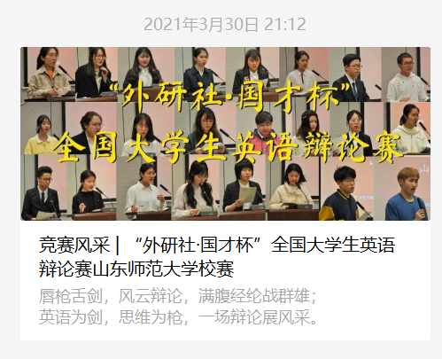 山东师范大学大学生英语竞赛中心于2020年11月27日成功落地外国语学院,成为外国语学院学生竞赛工作的又一项重要内容。该本中心负责承办的主要竞赛项目包括“外研社·国才杯”全国英语演讲、阅读、写作大赛,“外研社杯”全国大学生英语辩论赛,“21世纪杯”英语演讲大赛,全国英语口译大赛,以及全国大学生英语竞赛等各项英语学科竞赛。