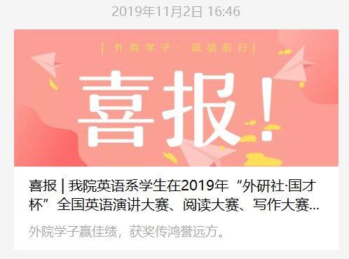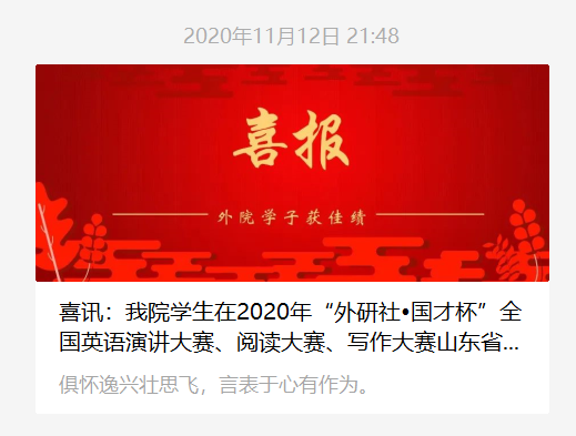 近年来,外院学生参加竞赛的人数及获奖层次不断攀升。2020年10月举行的“外研社·国才杯”全国英语演讲大赛、写作大赛及阅读大赛中,英语专业温新代表山师参加山东赛区总决赛,荣获山东赛区特等奖第一名,成功晋级全国总决赛。同期举行的阅读大赛及写作大赛校选赛吸引了众多同学的关注,英语专业万雨欣代表山师参加阅读大赛山东赛区总决赛,获得一等奖;英法复语专业马瑞钖参加写作大赛山东赛区总决赛,获得二等奖。