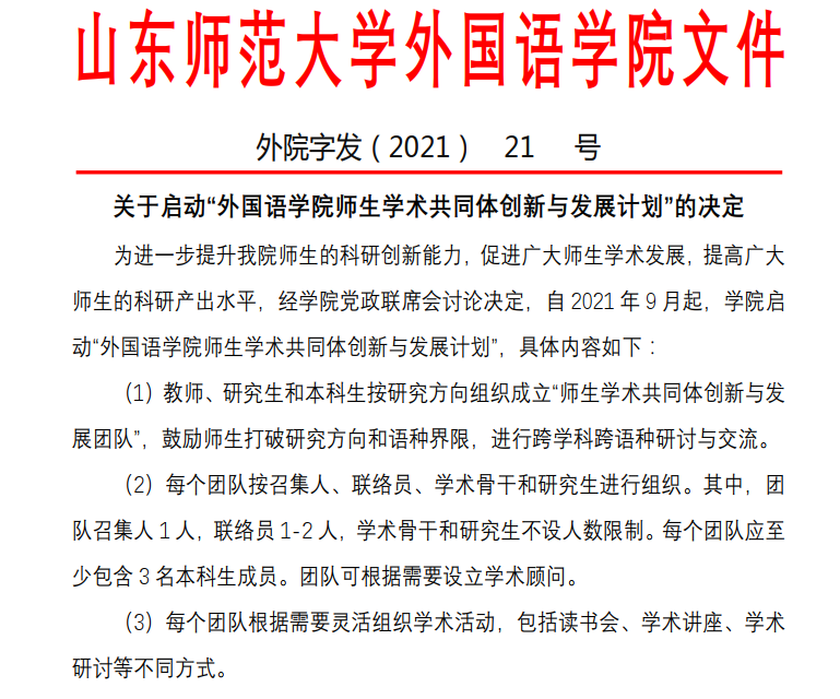 除依托教师技能培养工作坊和学科竞赛中心,为教师和学生的交流与沟通提供相关平台之外,2021年9月25日,学院以红头文件形式下发《关于启动“外国语学院师生学术共同体创新与发展计划”的决定》,以制度形式确立师生发展共同体的理念与具体实施路径,鼓励教师、研究生和本科生按研究方向组织成立“师生学术共同体创新与发展团队”,鼓励师生打破研究方向和语种界限,进行跨学科跨语种研讨与交流。该共同体的成立为教师与学生的共同发展提供了平台及保障。迄今为止,各学术共同体团队已举办活动20余场,在教师和学生中的影响明显,切实带动了教师和学生共同学习、教研的积极性,并已经开始在教师课程建设、论文撰写、项目申报,以及学生论文撰写及项目申报方面有相关产出。