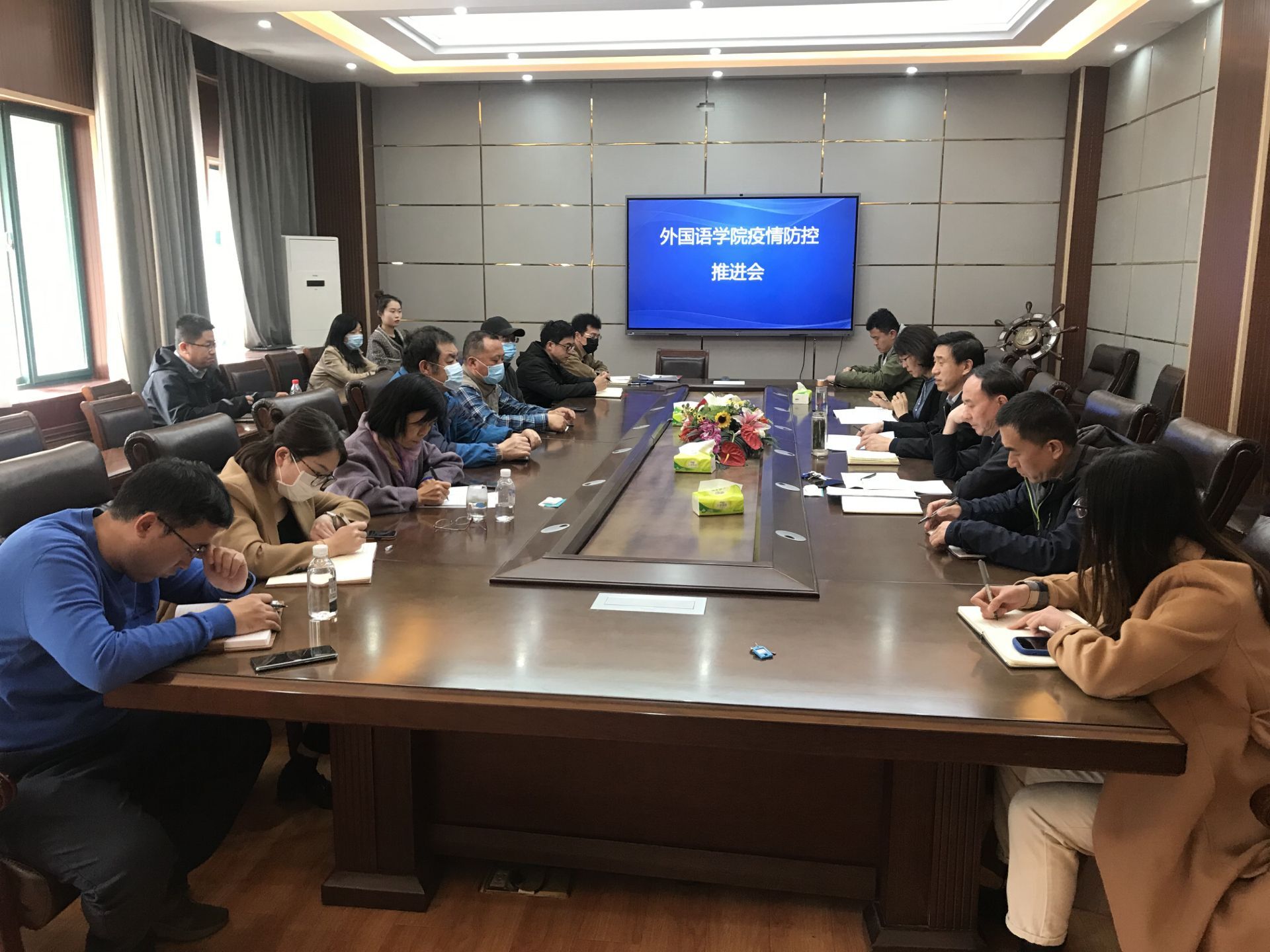 3月15日下午,外国语学院在文渊楼A区313会议室召开疫情防控工作推进会。学院全体领导班子成员、学院行政人员和全体辅导员参加了会议。会议由陶业涛副院长主持。
