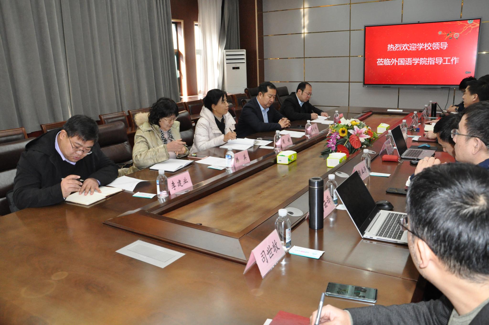 王卓院长首先代表学院对周婧书记和各部门领导的到来表示衷心感谢和热烈欢迎,并就外国语学院新学期开展工作情况进行了汇报。王卓院长围绕学院历史沿革、师资队伍建设与人才引进、学院外语学科与外语专业一体化培养建设、教育教学改革成果、一流专业建设、一流课程建设、大学外语教学改革、“双语双科”培养模式探索、博士授权点申报、师范类专业认证,以及新学期全院师生以饱满昂扬精神面貌迎接开学第一天等方面情况作了详细汇报,并对学院目前发展中存在的问题和未来的工作方向进行了阐释说明。