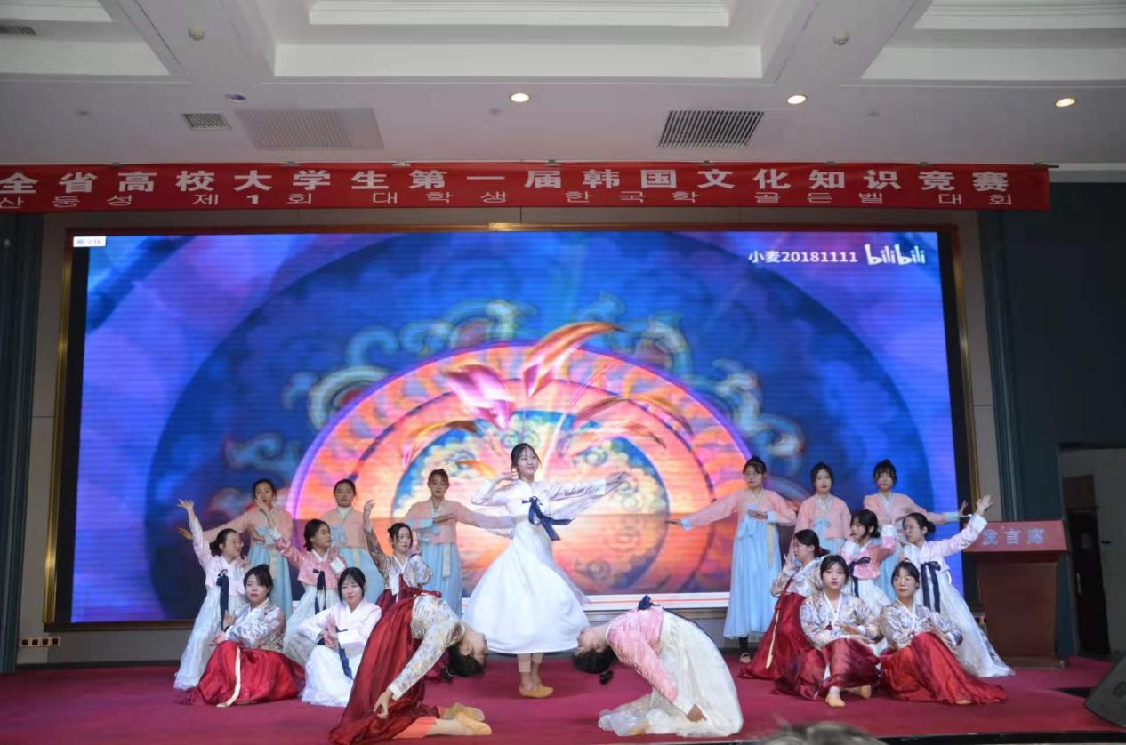首先,山东师范大学2020级韩语学子带来的精彩表演《阿里郎》拉开了本次大赛的序幕。她们身着典雅的韩服,在韩国传统民谣《阿里郎》婉转优美的旋律中翩翩起舞。
