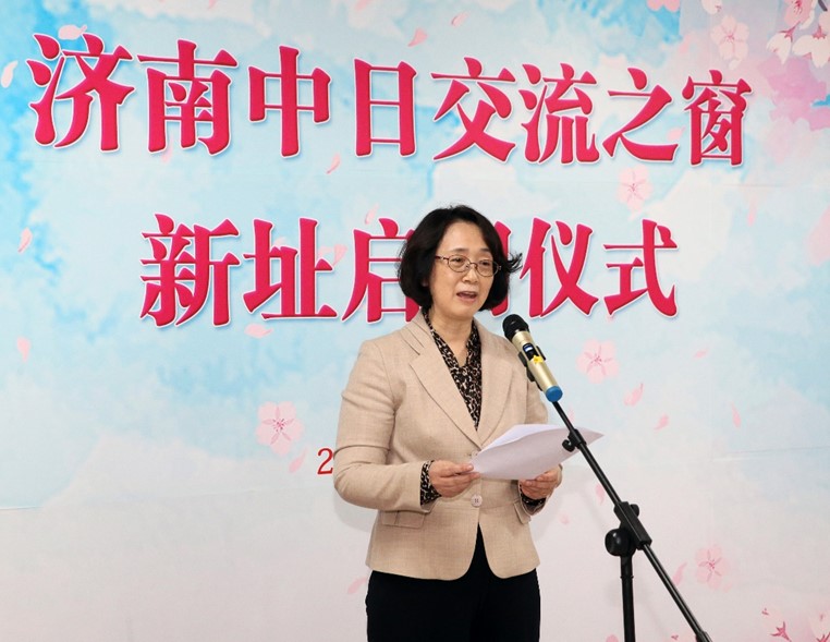 李荣副会长在致辞对新址落成表示热烈的祝贺,并向长期致力于推动山东省与日本友好交流合作的山东师范大学各位领导、老师们和同学们表示感谢,同时她也对在座的长期从事日语研究、对日文化传播的各位来宾也表示了衷心的感谢。她指出:中日两国一衣带水,前几日习近平主席在与日本的新任首相岸田文雄通话时特别强调,中日是近邻,亲人善礼,国之宝也,维护和发展中日友好合作关系,既符合两国和两国人民的根本利益,也有利于亚洲乃至世界的和平稳定和发展。李荣副会长希望济南交流之窗平台在今后的发展过程当中,能够更加广泛的面向社会开放,举办更丰富的一些活动,创新更多的交流合作的品牌,发挥更大的作用,特别是吸引更多的青少年,参与进来,增进他们对日本的兴趣和了解,培养更开阔的视野,投身中日友好事业。