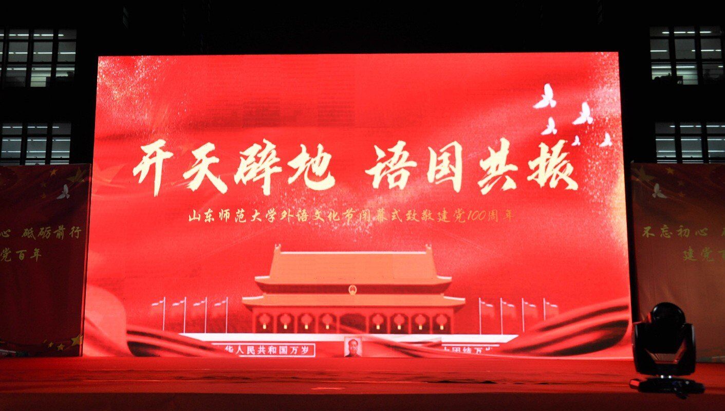 5月15日,由山东师范大学外国语学院举办的“开天辟地,‘语’国共振”——第八届外语文化节闭幕式在天颐广场圆满落幕。外国语学院党委书记岳希亮、院长王卓、副院长陶业涛以及外院教师代表出席本次活动,全体2020级学生到场观看演出。本次闭幕式在微博平台进行现场网络直播,在线观看人数突破三千。