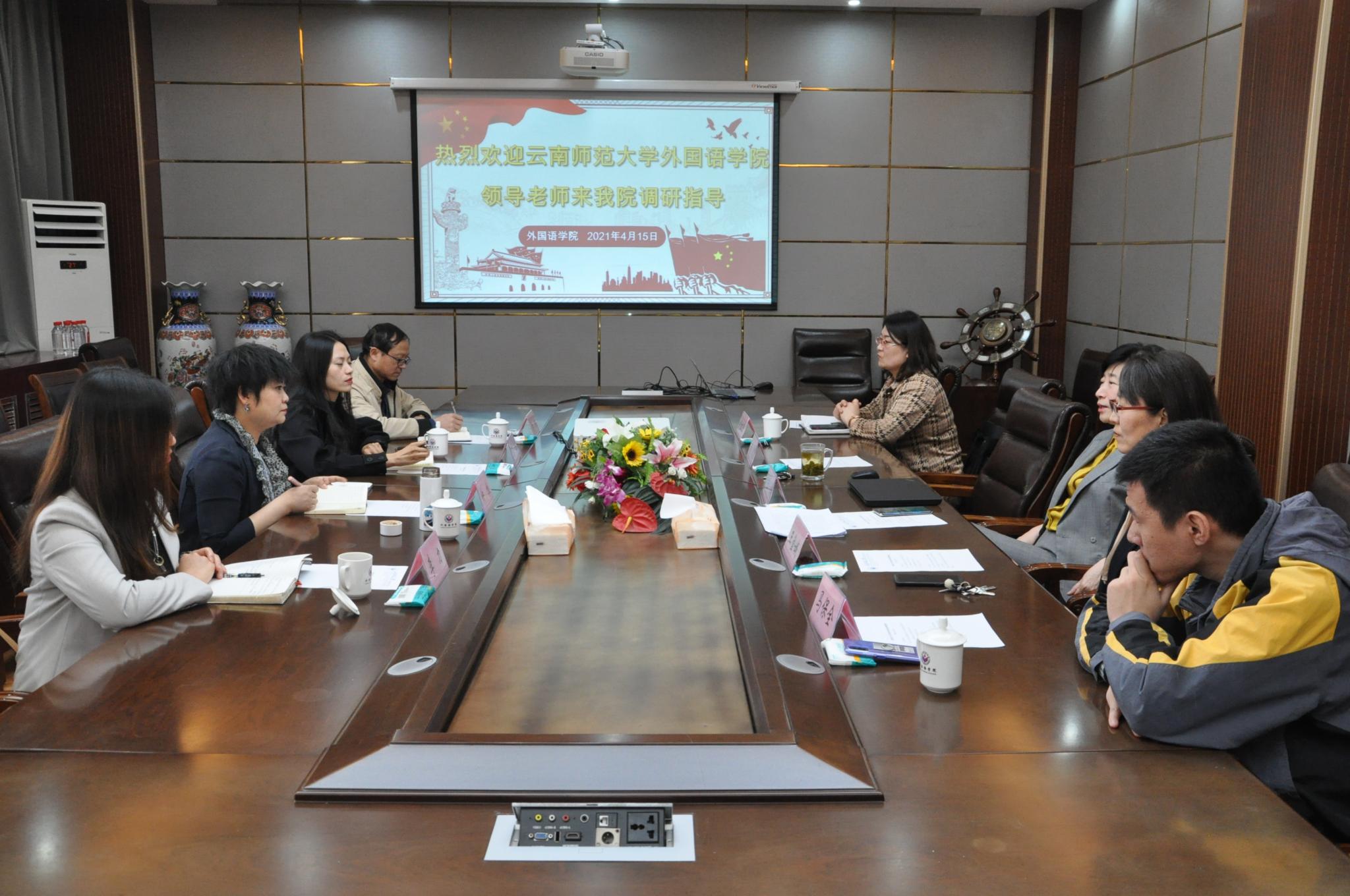座谈会上,王卓院长首先致辞,表示了对调研团队的热烈欢迎,并介绍了我院的基本情况、历史沿革、发展特色以及未来愿景。钟维副院长致谢,介绍了云南师范大学外国语学院的基本情况。之后,双方就英语一流专业建设、西班牙语与阿拉伯语人才培养、校企合作等方面的工作经验进行交流。双方还就各自面临的机遇与具体情况进行了深入探讨,也就不少共同关心的话题交换了意见,并介绍了各自经验。双方一致认为,两院的沟通与交流会进一步深入进行下去,并期待未来双方共同的发展与长期合作。