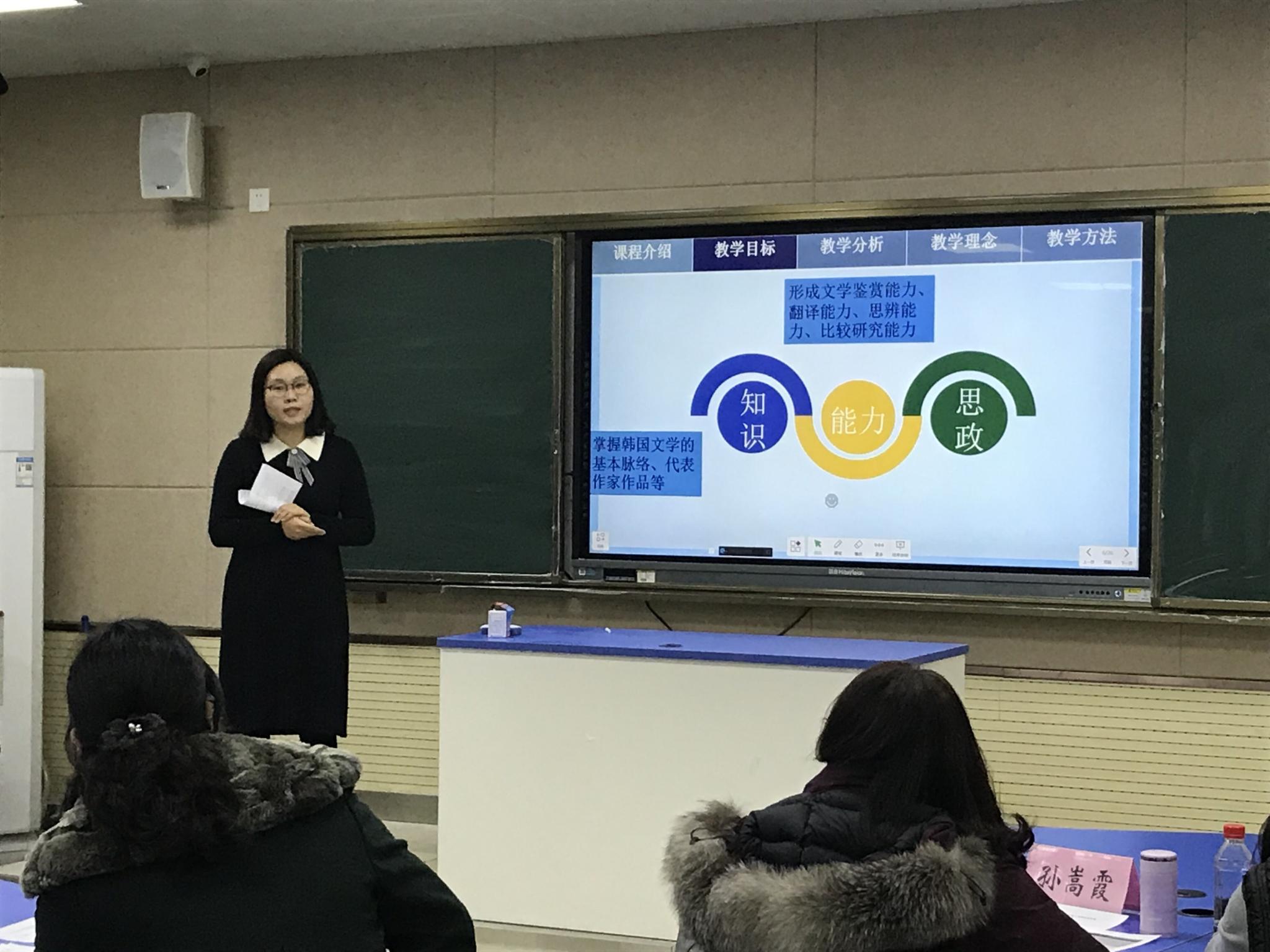 为积极响应学校有关举办山东师范大学首届教师教学创新大赛的号召,进一步提升外国语学院教师的教学热情及能力水平,激发外院教师在教学中运用先进教学理念、优化教学目标、创新教学方法,从而提高人才培养质量,并促进教师专业发展,外国语学院专门成立工作小组,认真制定了工作方案及办法,并于1月21日晚6:30在长清湖校区学院智慧教室B550举办了外国语学院首届教师教学创新大赛院级选拔赛。外国语学院院长王卓、副院长王金娥、校教学督导组成员胡艳玲,以及学院教学督导组组长蒋斌和部分督导组成员、系部主任等出席此次比赛,并担任评委。学院四十岁以下的青年教师全部到场观摩。