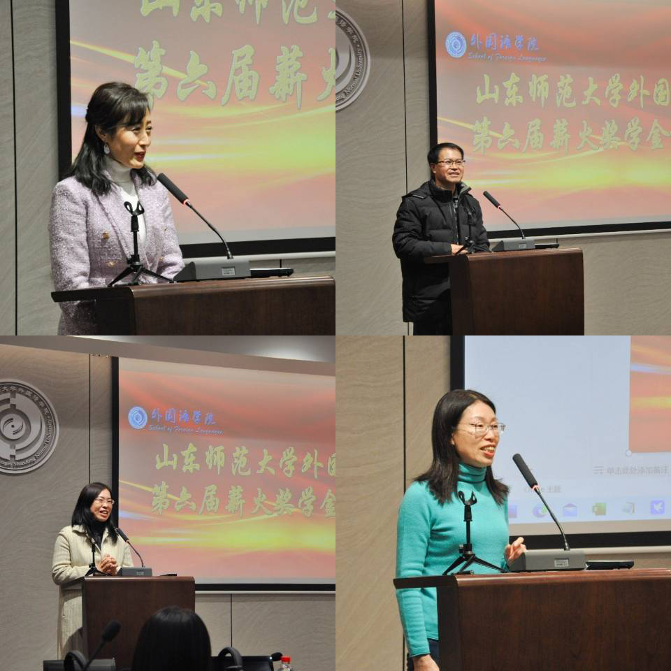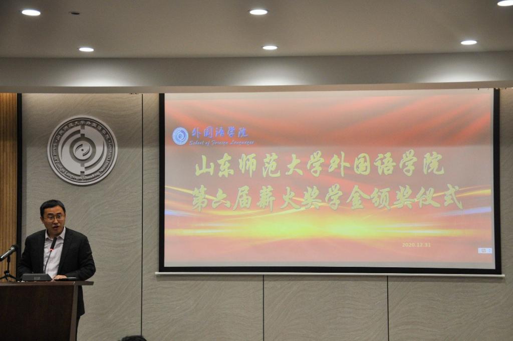 12月31日,外国语学院于山东师范大学长清湖校区文渊楼B座242多功能厅举办第六届薪火相传奖学金颁奖仪式。外国语学院88级校友孙德新、王萍、刘辛、刘燕玲、孙岩梅、刘翔宇、周志民、范庆胜、周新宇到场参加颁奖仪式,山东师范大学学生处处长李鹏健、山东师范大学对外合作办公室主任陈文亮、外国语学院党委书记岳希亮、院长王卓、党委副书记张京国、副院长王金娥、俄语系主任孙嵩霞以及全体辅导员出席本次颁奖仪式。本次颁奖仪式由外国语学院团委书记司世牧主持,2019级获奖同学以及部分2020级学生参加仪式。