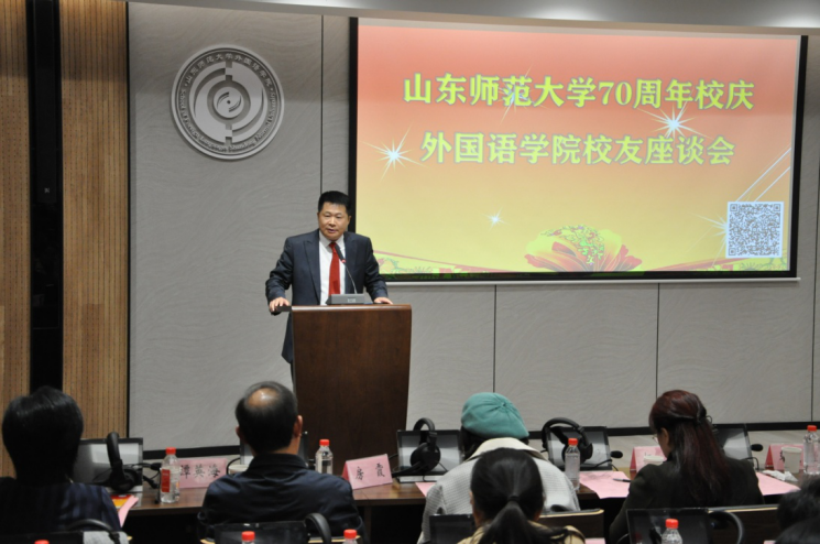 七十年岁月鎏金,山东师范大学与祖国一同成长,以辛勤耕耘孕育桃李芬芳!为热烈庆祝山东师范大学建校七十周年,增进与校友的互动交流,助力学校学院更好发展,10月29日下午,山东师范大学70周年校庆外国语学院校友座谈会在长清湖校区B区242同声传译多功能厅隆重举行。学院退休教师代表赵俊英、韩贞全、杨敏,曾在外国语学院工作过的原党委书记谭英海、原副院长巩建波等多位领导老师应邀出席活动。学院校友代表、党政领导、教师代表和学生代表们欢聚一堂,共庆母校七十华诞,共叙同窗之情。座谈会由学院工会主席侯青龙与学生代表李艺涵主持。