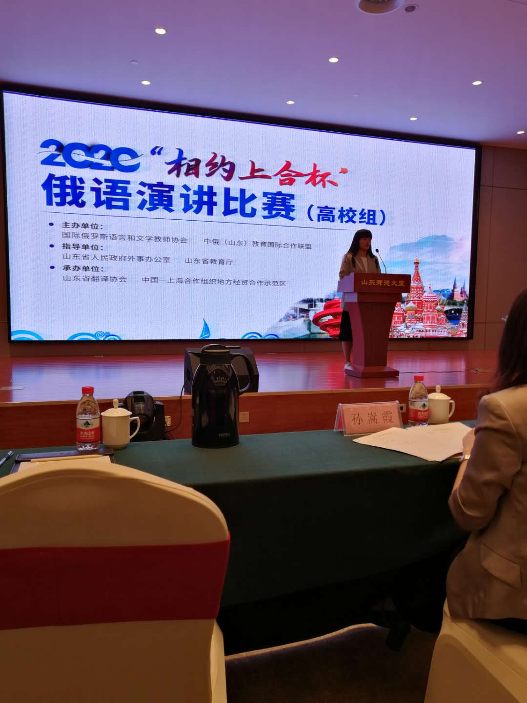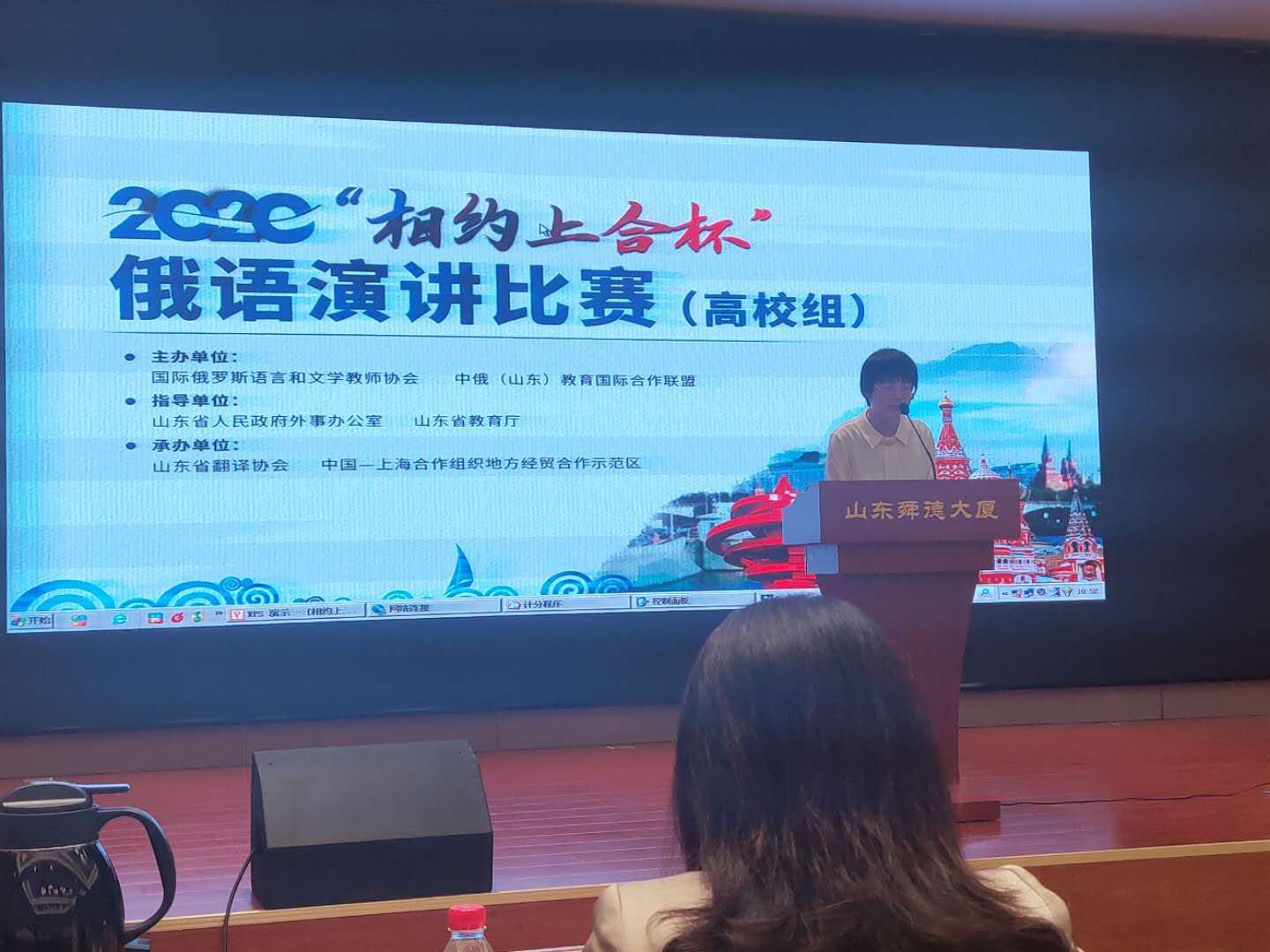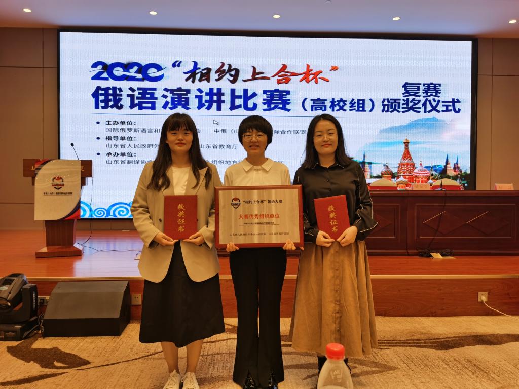 2020年9月25日,2020“相约上合杯”俄语演讲比赛(高校组)在济南举办。本次比赛由省外办和省教育厅指导,国际俄罗斯语言和文学教师协会、中俄(山东)教育国际合作联盟共同主办,山东省翻译协会、上合组织地方经贸合作示范区承办,来自山东省内32所高校的84名选手参加了比赛。