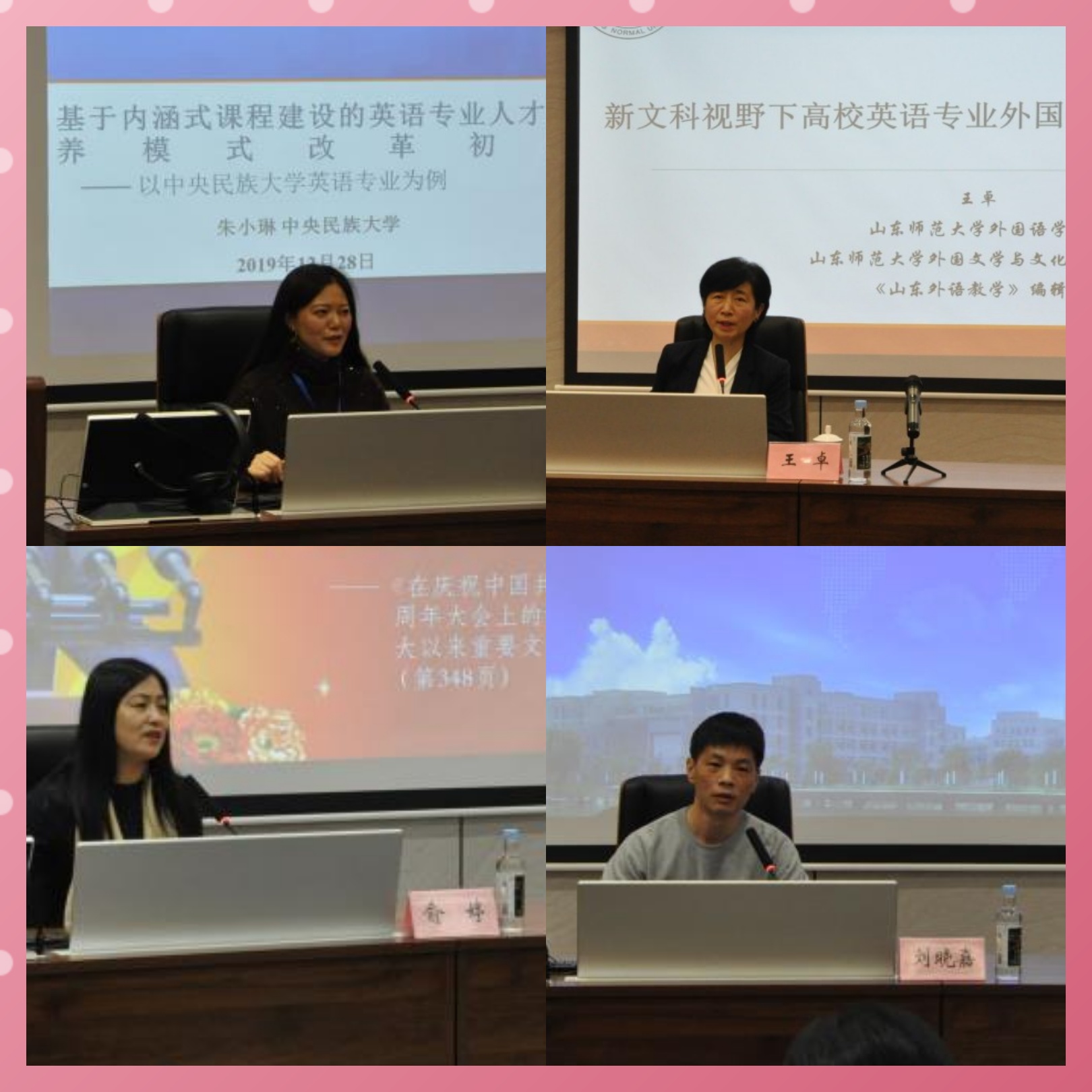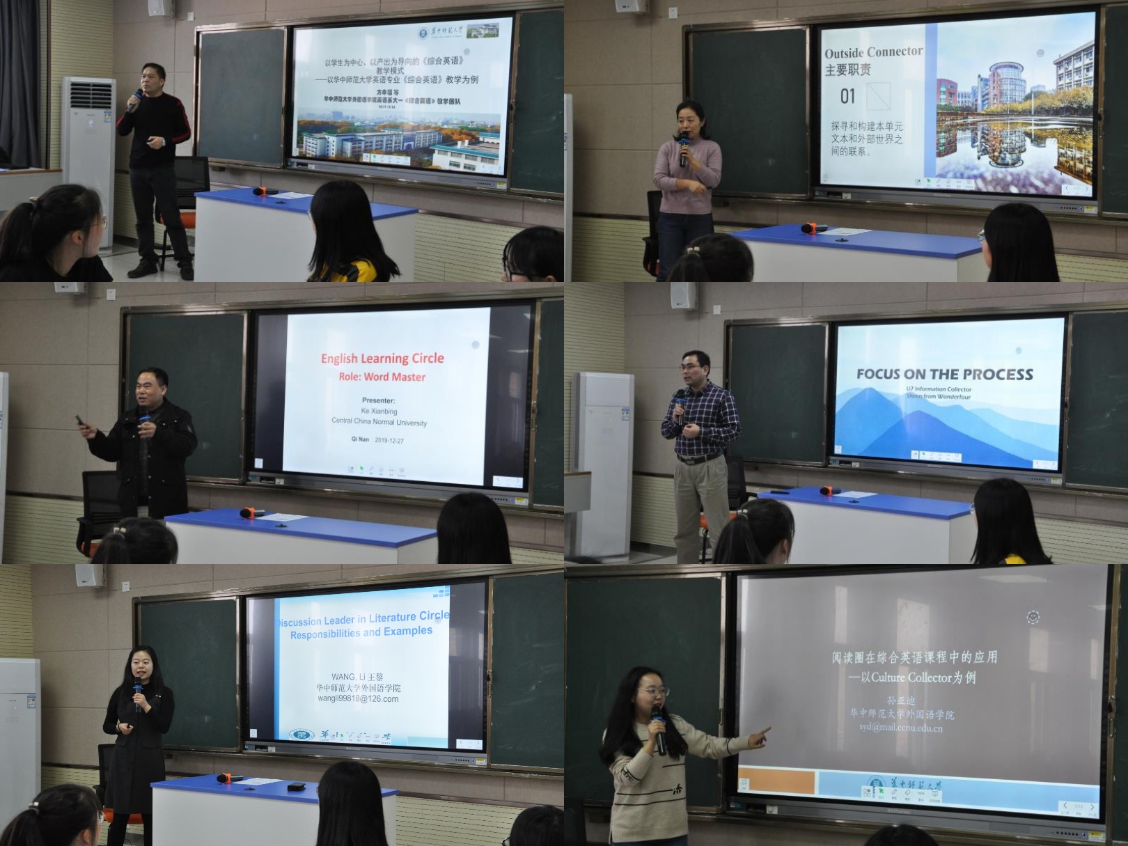 28日下午,人文英语教学展示在外国语学院B550智慧教室进行,由山东师范大学外国语学院刘震副教授主持。华中师范大学外国语学院方幸福教授以英语专业《综合英语》教学为例,展示了以学生为中心、以产出为导向的《综合英语》教学模式。该教学模式基于English Learning Circle, 提出了学生在学习过程中扮演的六种角色:Discussion Leader, Information Collector, Passage Person, Outside Collector, Cultural Collector 和Word Master。 华中师范大学外国语学院英语系《综合英语》教学团队的五位老师结合自己的教学实践详细阐述了学生在扮演六种角色时需要完成的各项工作和教师在教学过程中的作用。山东师范大学外国语学院《综合英语》教学团队的王秀香和刘焱两位老师以具体文本为例进行了说课和实际的课堂展示。之后,罗良功、刘永杰、潘震、朱小琳、俞婷五位与会专家对两个团队精彩的教学展示进行了点评,王卓院长对课程展示环节进行了总结。专家们对两个教学团队的表现给与了充分肯定,并一致认为人文英语系列教材《综合英语》凸显了人文性,必将进一步带动外语专业教学方式和理念的深入变革,与会教学团队展示的由人文系列教材推动的教学模式改革也为中国外语教育改革提供了范本。