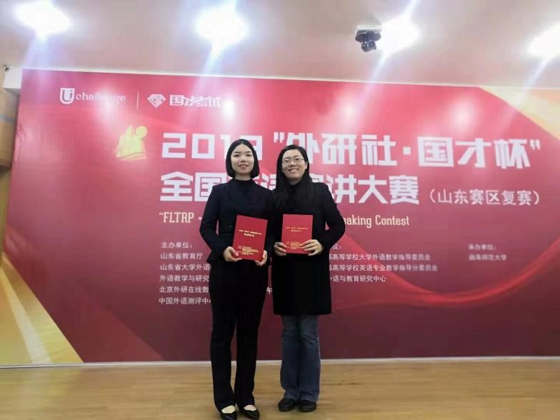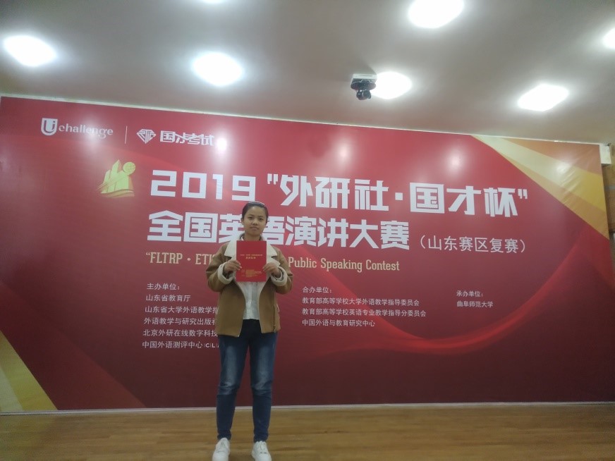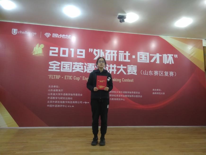 10月26日至27日,2019年“外研社•国才杯”全国英语演讲大赛、阅读大赛、写作大赛山东省复赛在曲阜师范大学举行。来自全省70余所高校的404名选手同场竞技,各显身手。经过激烈角逐,我院2019级英语口译专业学生王臻荣获演讲大赛省级特等奖,位列全省复赛选手第一名,成功晋级“外研社•国才杯”全国英语演讲大赛全国总决赛。2017级英语专业学生邱吉尔荣获阅读大赛省级一等奖,2018级英语专业学生王悦荣获写作大赛省级三等奖。