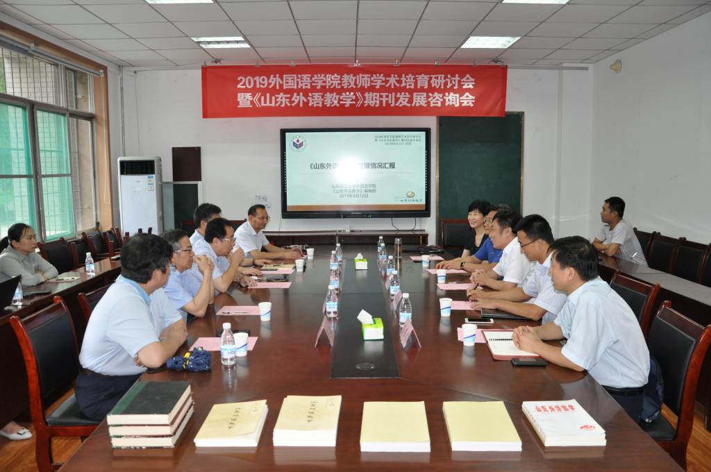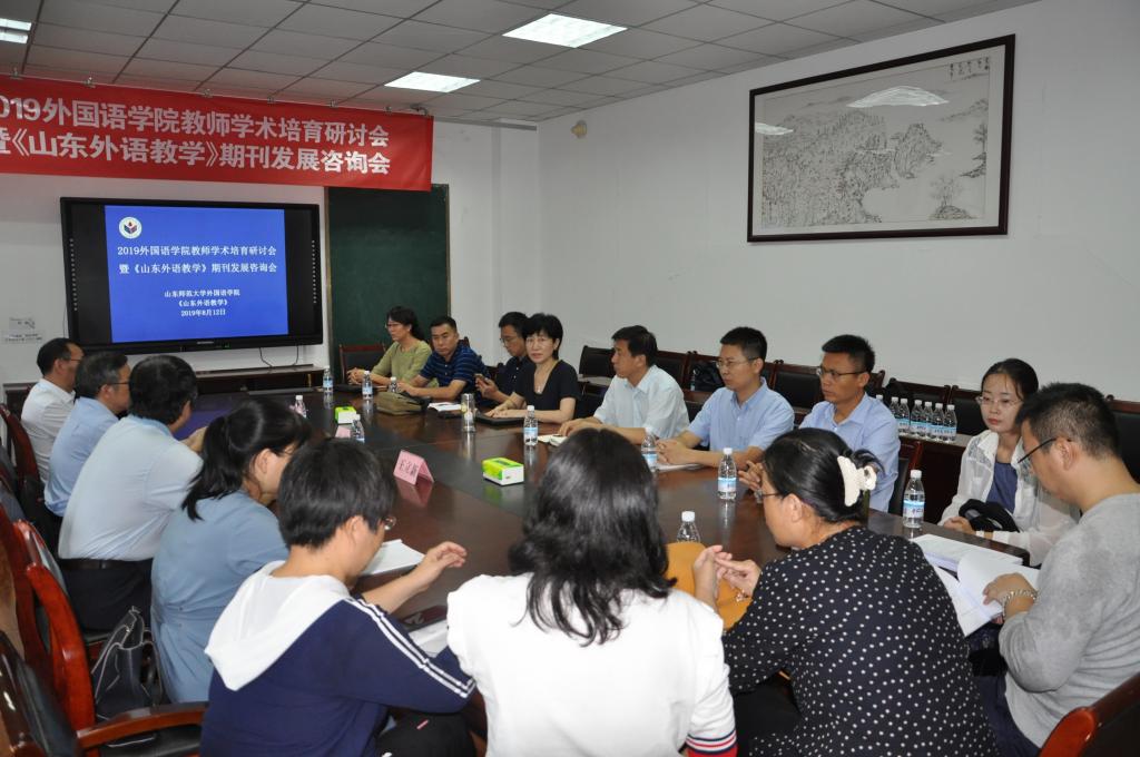 8月12日,2019外国语学院教师学术培育研讨会暨《山东外语教学》期刊发展咨询会在山东师范大学千佛山校区教学三楼顺利举行。本次学术活动旨在提升外国语学院教师的学术能力,培育具有前沿性、创新性和高显示度的学术成果,进一步实现学科、期刊协同发展,促进《山东外语教学》继续往高水平期刊迈进。西南大学的文旭教授、南开大学的王立新教授和张文忠教授在上午举行的教师学术培育研讨会上做了主题演讲,并参加了下午举行的《山东外语教学》期刊发展咨询会,为《山东外语教学》的进一步发展建言献策。省社科联党组副书记、副主席周忠高,我校副校长万光侠、山东省委宣传部出版管理处副处长吴永亮、我校社会科学处处长高景海,《山东师范大学学报(人文社会科学版)》主编李宗刚出席了下午的期刊发展咨询会。会议由山东师范大学外国语学院院长、《山东外语教学》主编王卓主持。外国语学院党委书记岳希亮、学院其他领导班子成员、我院部分骨干教师、编辑部编辑团队成员参加了会议。