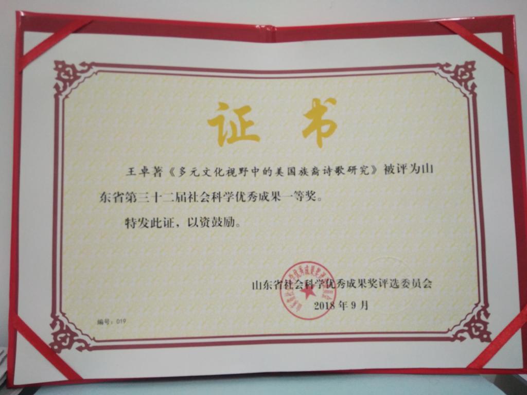 近日,省社会科学优秀成果评奖委员会公布了山东省第三十二届社会科学优秀成果奖获奖结果,我院王卓教授的专著《多元文化视野中的美国族裔诗歌研究》,在此次评奖中荣获一等奖。这是我院近几年来在省社科评奖中获得的最好成绩,也是近几年获得的特别有价值、有影响的社科成果.