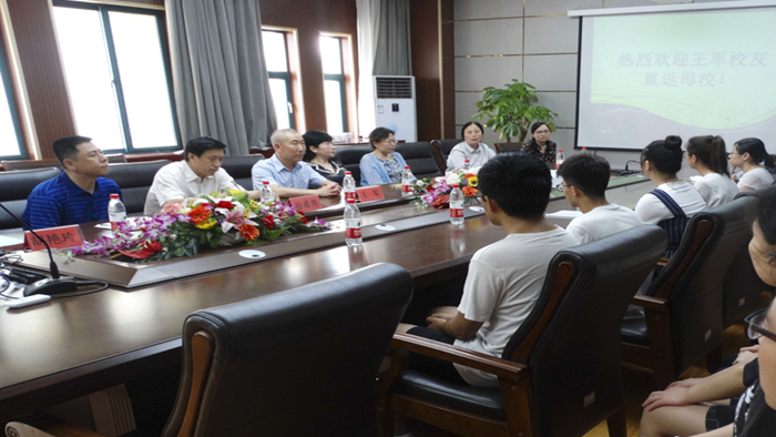 7月2日下午,外国语学院于综合教学楼A区会议室迎接日语系83级校友王军先生回母校交流座谈。外国语学院党委书记岳希亮、院长王卓、党委副书记金鹏、副院长胡艳玲、副院长岑玮、日语系主任李光贞及日语系教师张强、崔颖、郑玉贵出席了此次会议。2016级日语系17位学生代表也参与其中。