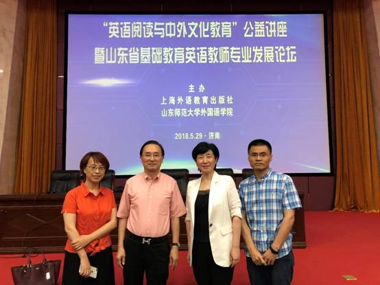 2018年5月29日,由上海外语教育出版社与山东师范大学外国语学院共同主办的“英语阅读与中外文化教育公益讲座暨山东省基础教育英语教师专业发展论坛”在山东师范大学千佛山校区成功举行。来自全省多个地区的中小学英语教研员、中小学校长和中小学英语教师,以及外国语学院英语学科教学和课程与教学论学位点的部分师生近三百人参加会议,5000多位老师通过网络直播在线观看了论坛。