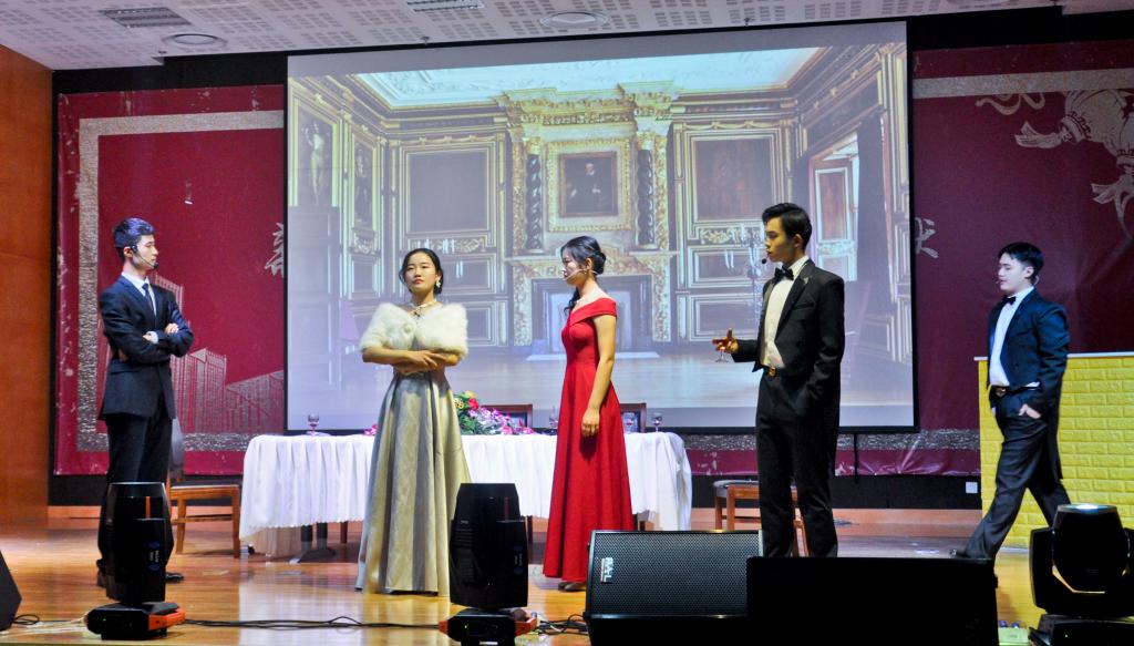 本次《探长来访》全英文戏剧演出,是学院外语文化节的重头戏。前期,岑玮教授指导学生对剧本进行改编,贾磊副教授,王锦副教授对演员进行选拔与推荐。主演分别来自本科生一二年级和研究生一年级,导演幕后由研究生和本科生共同担任。学院还邀请音乐学院教师杨珅对舞台表现和演出进行多次指导。经过半年的精心准备,师生倾力奉献,呈现了一台精彩绝伦的英文戏剧演出。