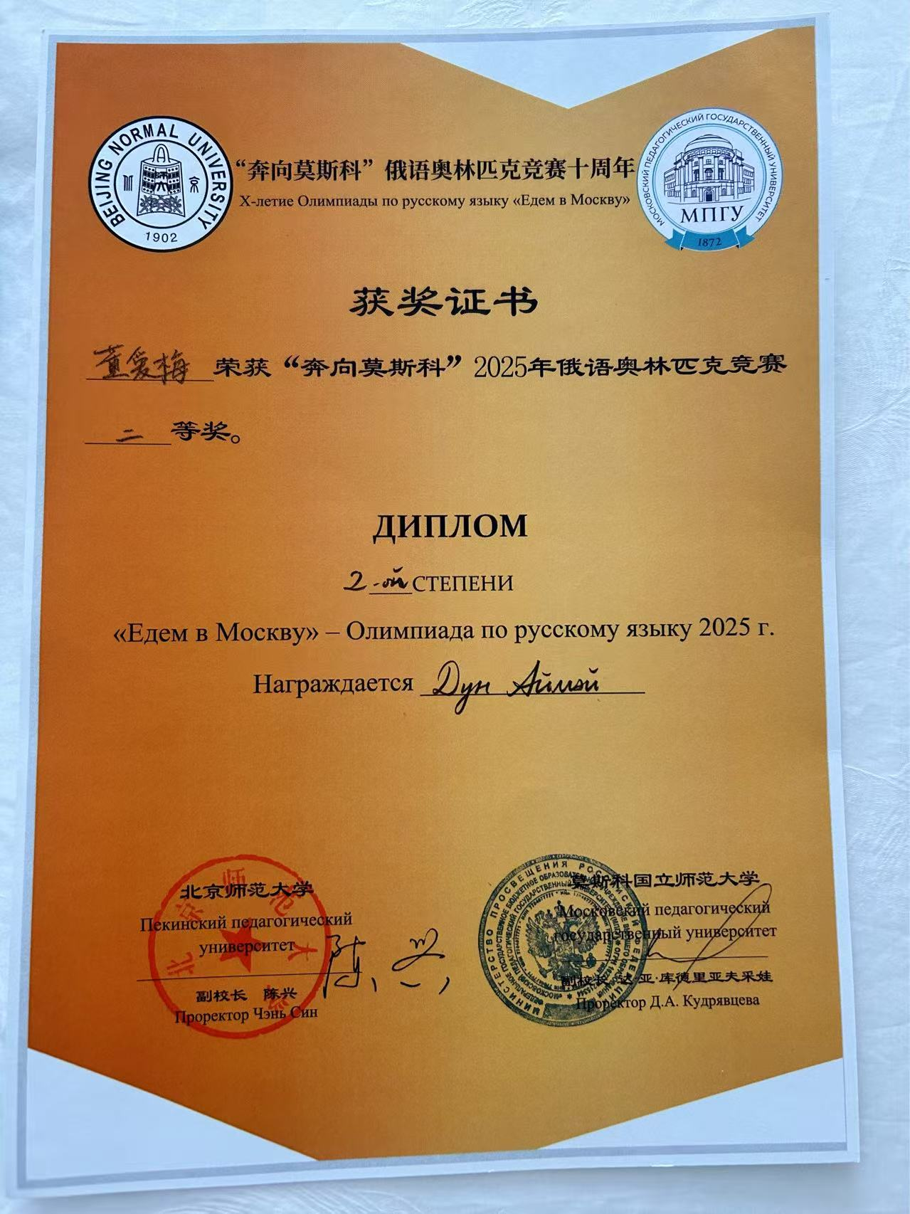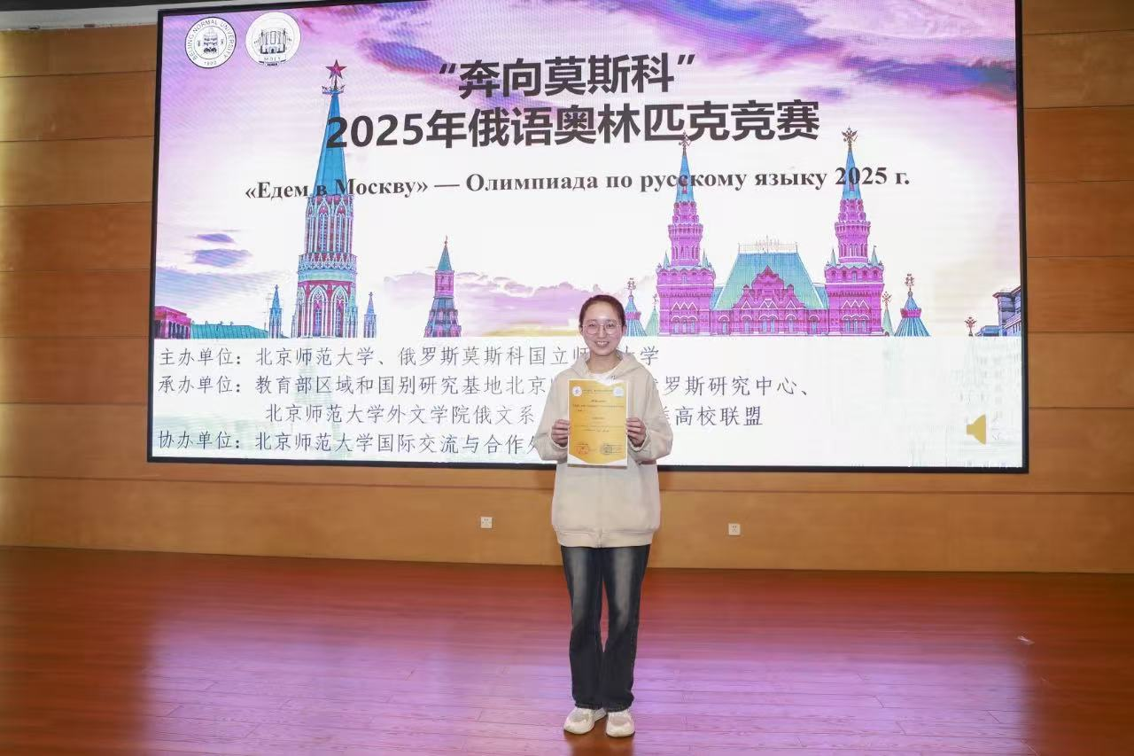 2025年4月,第十届“奔向莫斯科”俄语奥林匹克竞赛决赛在北京师范大学珠海校区举行。本届赛事由北京师范大学与莫斯科国立师范大学联合主办,吸引全国多所师范院校百余名俄语专业学生参与。此次赛事系我院学生首次参赛,俄语专业大二学生刘烨臻和大三学生董爱梅闯入决赛。经过激烈角逐,董爱梅同学凭借扎实的专业素养与出色的临场表现,荣获全国二等奖,彰显了我院俄语教学的扎实功底与育人成效。