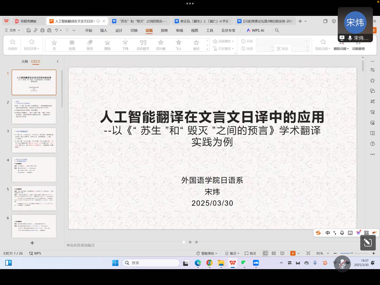 接下来的发言者是宋炜博士,其题目为《人工智能翻译在文言文日译中的应用——以<“苏生”和“毁灭”之间的预言>为例》。在发言中,宋博士以文言文日译中实践中的具体案例,对deepseek、文心一言、百度翻译的翻译结果进行了对比分析,宋博士指出:以deepseek为代表的人工智能在语言要素断句、双重解码能力及文体选择的适配性等方面优于传统的百度翻译。最后,宋炜博士通过举例鲁迅与古汉籍翻译实践案例,总结说明了人工智能在文言文日译实践与文化阐释方面的优点和不足。