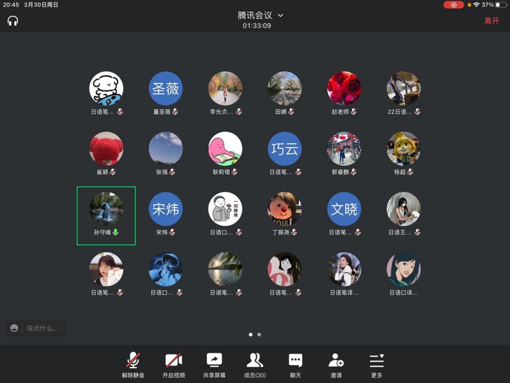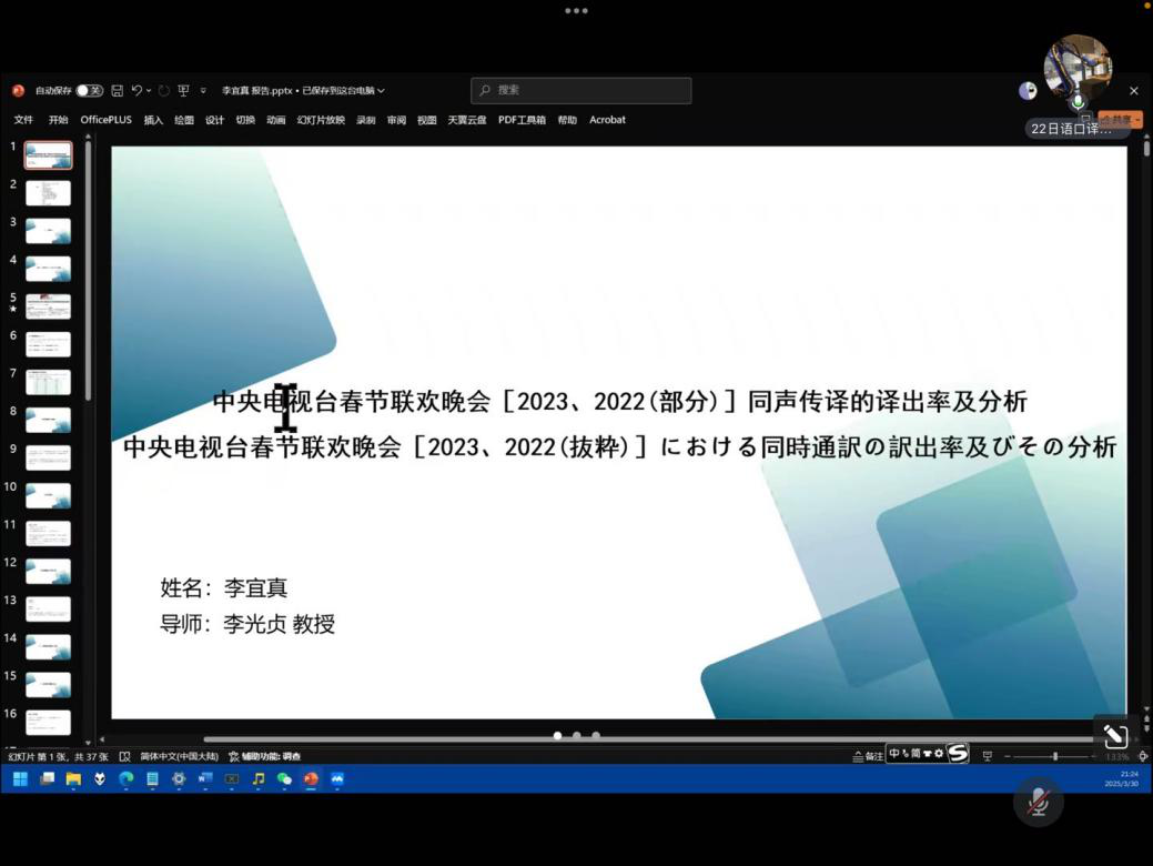 2025年3月30日,省级研究平台——山东省与日本合作研究中心成功举办外国语学院2025年第二期常青学术论坛学术提升系列活动——翻译实践与文化阐释学术研讨会。本次论坛由日语系主任、山东省与日本合作研究中心副主任崔颖副教授担任主持人,日语系孙守峰教授进行点评。日语系青年教师郭睿麒博士、宋炜博士以及翻译硕士方向三年级两位研究生——公派至我校日本实习基地日本九州外国语学院东京校区留学的丁振尧、日本东北公益文科大学交换留学的李宜真同学——就最近的学术研究进展进行了主题汇报,日语系全体研究生及部分教师参加了会议。中心主任李光贞教授也参加了会议,会议采取腾讯会议在线上举行。