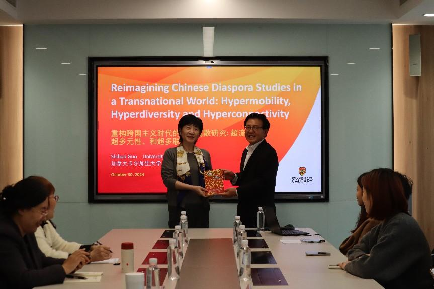 郭教授首先向外国语学院赠送了最新一期学术期刊Canada Ethnic Studies,随后从五个方面展开论述,依次为大家讲解了华人离散研究的历史背景、华人离散研究的术语定义、跨国主义和离散的转变范式、跨国主义时代华人离散研究的分析与建构和其他值得深入探究的学术前沿问题。