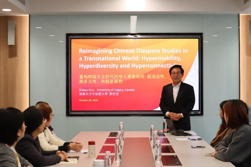 10月30日下午,加拿大卡尔加里大学终身教授、英国诺丁汉大学荣誉教授郭世宝受邀做客外国语学院,为我院师生作了题为“重构跨国主义时代的华人离散研究:超流动性、超多元性、和超多联性”的学术讲座。本次讲座由外国语学院院长王卓主持,外国语学院教授惠敏、国际办公室主任李静、青年教师姜毓星和学院研究生参加讲座。