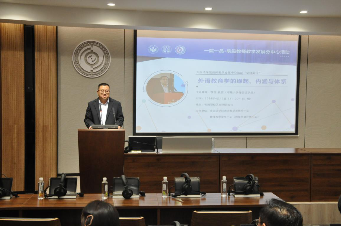 4月18日下午,外国语学院教师教学发展分中心“语师同行”活动讲座在文渊楼A区A242成功举办。本次讲座由外国语学院教师教学发展分中心、教师教学发展中心(教学质量评估中心)主办。主讲嘉宾为南开大学外国语学院博士生导师、副院长李民教授。讲座主题为:外语教育学的缘起、内涵和体系。讲座由副院长张媛教授主持,学院各系部骨干教师及研究生参加了此次讲座。