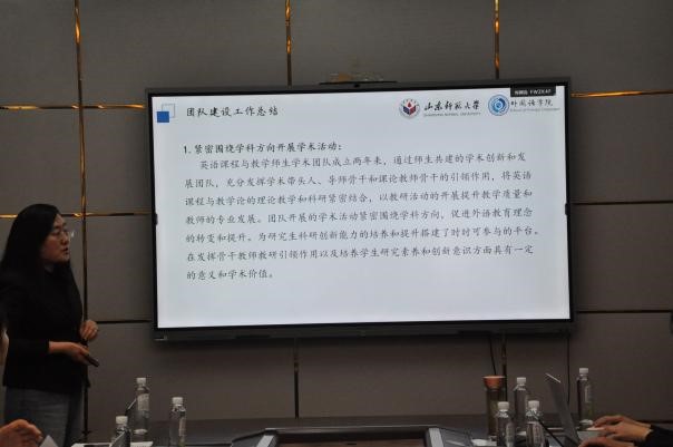 会议伊始,王卓院长介绍了第一届“师生学术共同体创新与发展团队”的六个团队,分别是毕晓毅负责的“中国教育话语传播”、胡艳玲负责的“英语课程与教学论”、宋来全负责的“认知教学创新与发展”、孙嵩霞负责的“俄语语言文学与文化”、王秀香负责的“基于《综合英语》的课程教学与研究”、翟乃海负责的“当代英语文学跨学科跨媒介研究”。六名团队负责人依次对团队基本情况进行了汇报,内容包括:团队成员组成、团队建设情况、项目成果与后期规划。