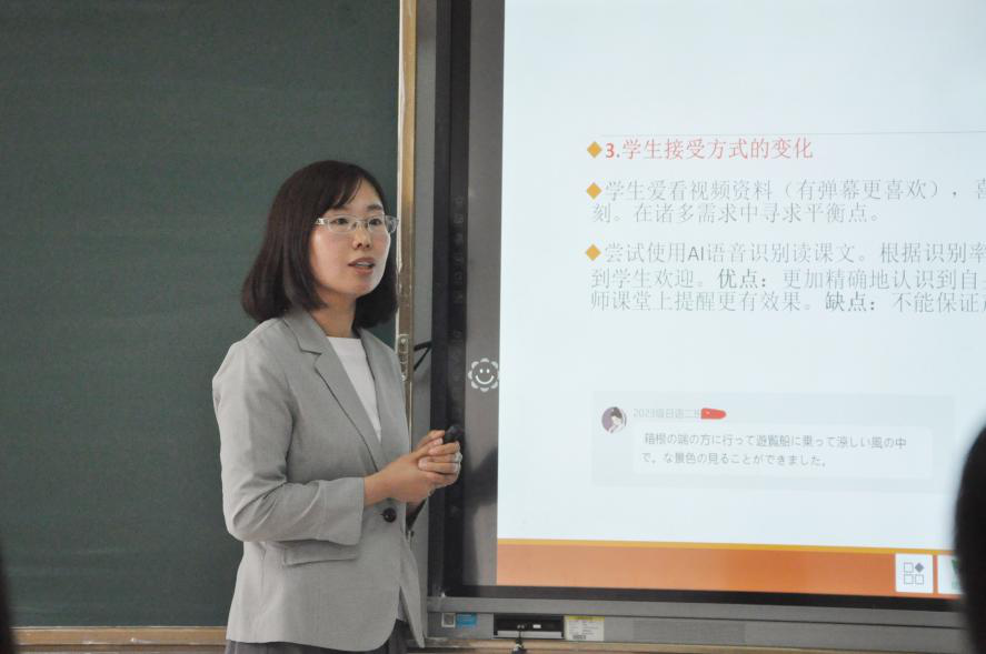 崔颖主任同样肯定了王晶老师扎实的教学基本功及充实的教学内容。她认为:首先,王晶老师对学情有着深刻的了解,能够做到因材施教;其次,善于利用科学技术丰富教学内容,有效实现了科学技术与教学内容的有效融合,教学逻辑性强;最后,教学过程中真正做到了以学生为中心,积极与学生沟通交流,有温度地培养学生的学习兴趣,教学方法摆脱了简单的语言技能和语言知识的灌输,做到了层层深入教学。