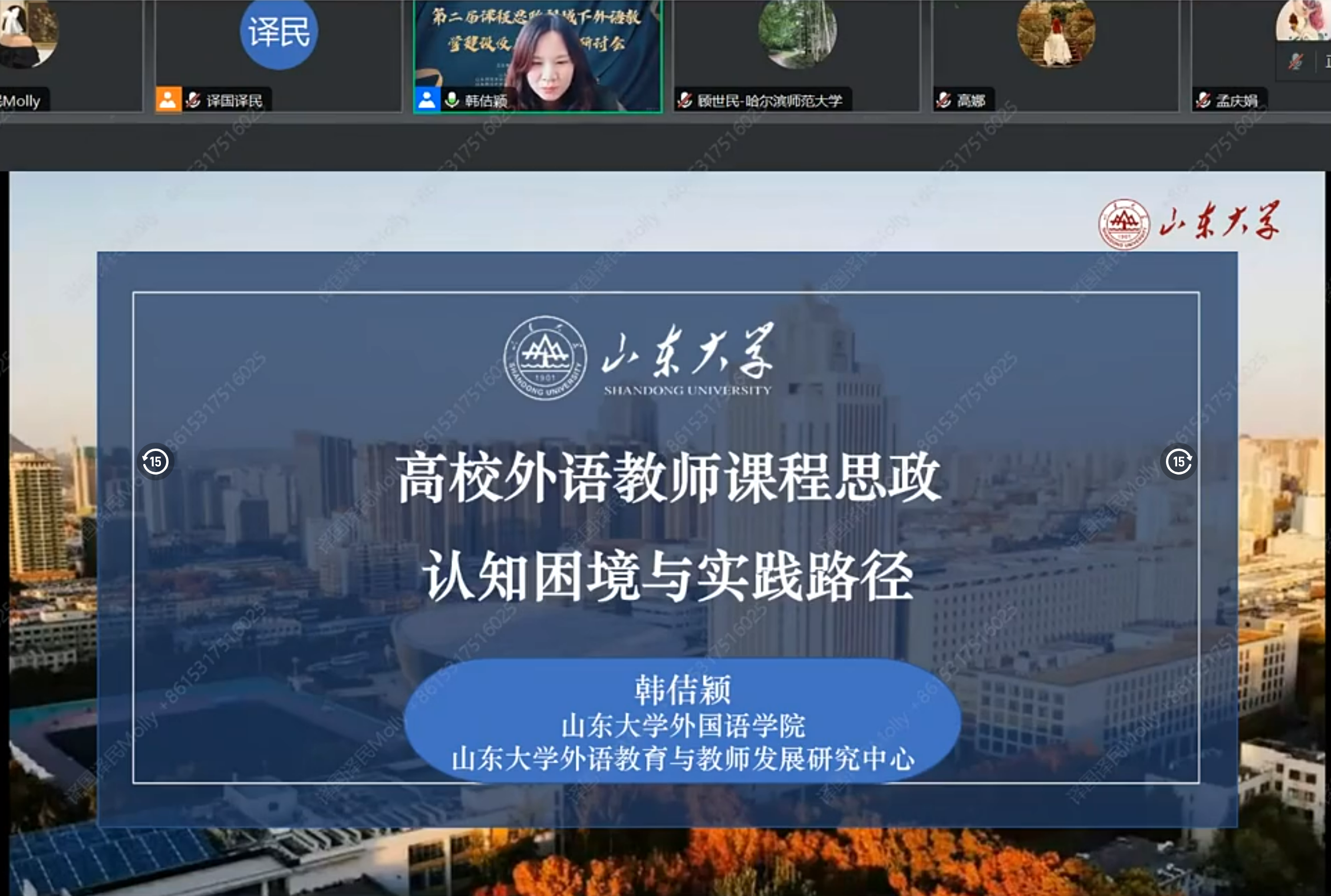 16日下午,山东大学外国语学院、山东大学外语教育与教师发展研究中心韩佶颖教授聚焦高校外语教师,从个体、微观的角度探讨了高校外语教师课程思政的认知困境和实践路径。哈尔滨师范大学外国语学院的顾世民教授以课程思政视阈下英语文化类课程的建设为切入点,探讨了如何理解文化,如何理解跨文化能力,并分享了关于语言和文化教学的思考。