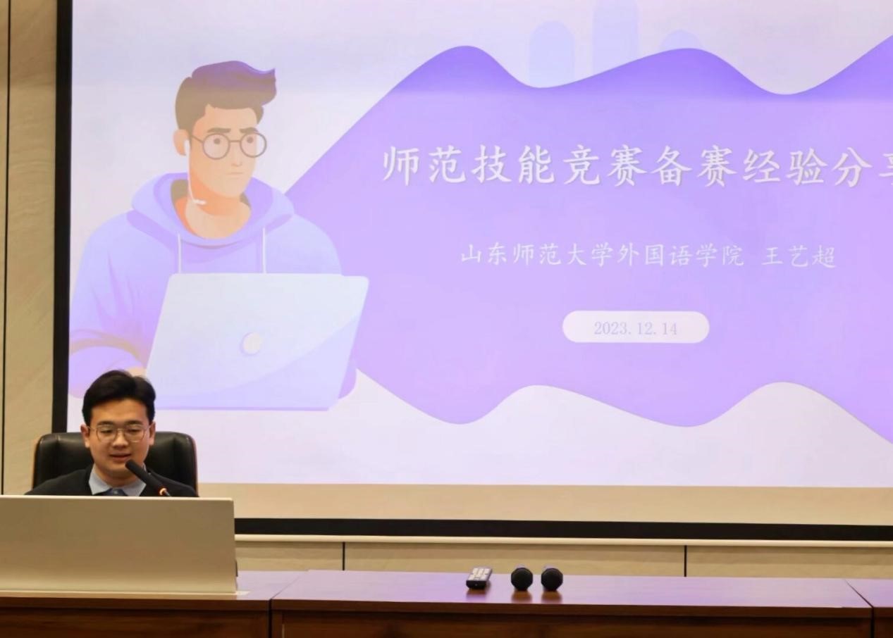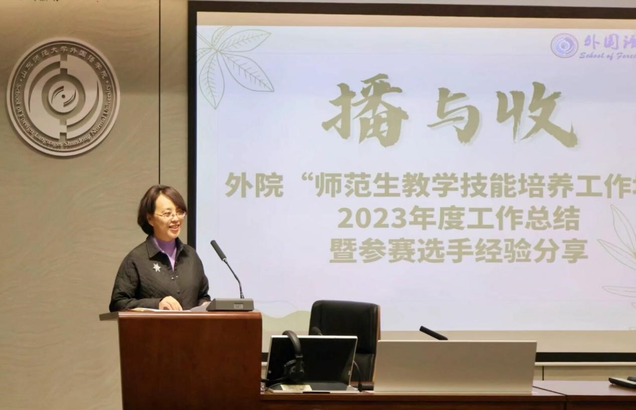 会上首先由王锦老师对2022年至2023年师范生教学技能培养工作坊的工作成就进行总结。她指出,工作坊自2019年6月成立以来的四年时间,始终以当前各类师范生从业技能大赛人才选拔和培养为切入口,打造有利于学生专业成长、有助于教师专业发展的学院人才培养和教师专业发展的共同平台。经过工作坊培养,我院学子在全国和全省范围重要师范类技能竞赛中收获颇丰。尤其是在2022年和2023年,工作坊团队师生共斩获国家级一等奖2人次、省级一等奖项7人次、省级二等奖6人次、省级三等奖5人次。其中2022年的“第十届山东省师范类高校学生从业技能大赛”外国语学院6人团队战绩卓著,共获得4个一等奖、1个二等奖、1个三等奖的优异成绩;在2023年“第十一届山东省师范类高校学生从业技能大赛”上,我院共有10名同学获得省赛决赛资格,成为我校各学科各专业获得决赛资格最多的一支参赛队伍,并最终获得3个一等奖、4个二等奖、3个三等奖的好成绩。我院2020级英语专业王艺超同学同时获得国家级和省级师范类高校学生教学技能大赛3个一等奖项,成为一颗耀眼的教学新星。
