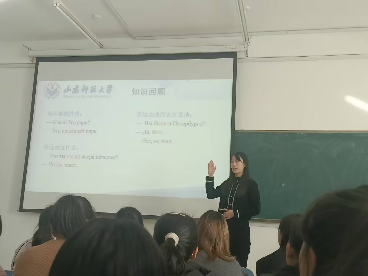 王艺璇老师此次教授的《基础俄语》课程主要讲解动词的过去时性、数变化以及接格关系。本次课程结构分为知识回顾、新课学习和小组练习三个环节,深入讲解词汇、语法和句型,并针对讲解内容进行翻译和造句练习。同时,王艺璇老师还将语言内容与思政教育、国情文化知识相结合,以中俄两国“英雄城市”为切入点,有机融入中俄文化对比内容,注重培养学生跨文化交流意识和“家国情怀”。最后,在练习环节,王艺璇老师以小组游戏“滚雪球”的形式开展,引导全班同学参与,调动学生积极性,增加课堂趣味性。