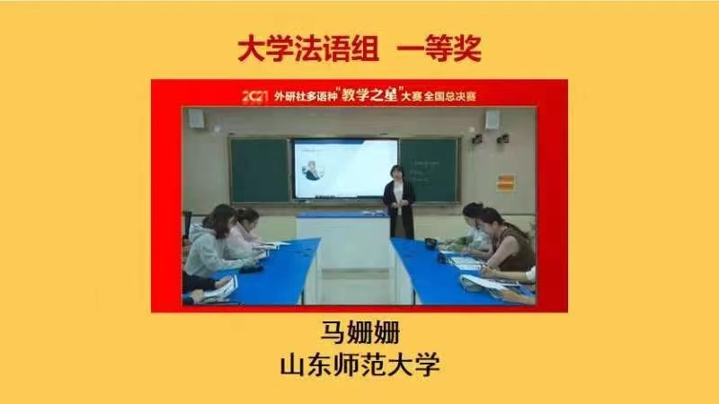 近年来,山东师范大学及外国语学院十分重视教学发展,坚持以赛促教、以赛促学、以赛促建,不断加强教学队伍建设,提升课程建设水平。学院积极开展课程观摩、教学比赛等各种教学活动,马姗姗老师也积极参加外国语学院的各种教师技能比赛等。本次大赛以《国标》为导向,鼓励参赛教师大胆探索教育新方法、充分挖掘教育新资源,深度融合课程创新与课程思政教育新路径,以促进自身教学能力的提升、教学手段的转变、教学模式的创新和教学效果的提升。马姗姗老师从大学法语综合课的定位出发,对所选教材及该学段学生认知特点进行精准分析,创新教学活动设计,并巧妙地融入课程思政,进行了教学理念新颖、教学思路清晰的说课及生动的教学展示,赢得了专家评委的一致认可,最终从众多选手中脱颖而出,摘得桂冠。