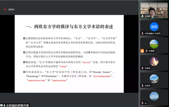12月2日晚7点,外国语学院联合社会科学处举办的第1208期社科大讲坛之“东方想象与他者凝视:俄国东方文学的东方学渊源” 于腾讯会议平台在线成功开展。本次讲座主讲嘉宾为华中师范大学文学院教授、博士生导师、山东师范大学98级俄语校友王树福教授。讲座由外国语学院院长王卓教授主持。“俄语语言文学与文化”团队全体成员、外国语学院部分其他专业师生、部分校外俄罗斯文学爱好者等130余人在线聆听了讲座。