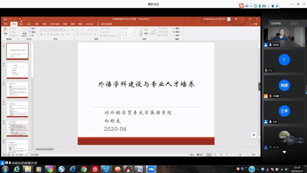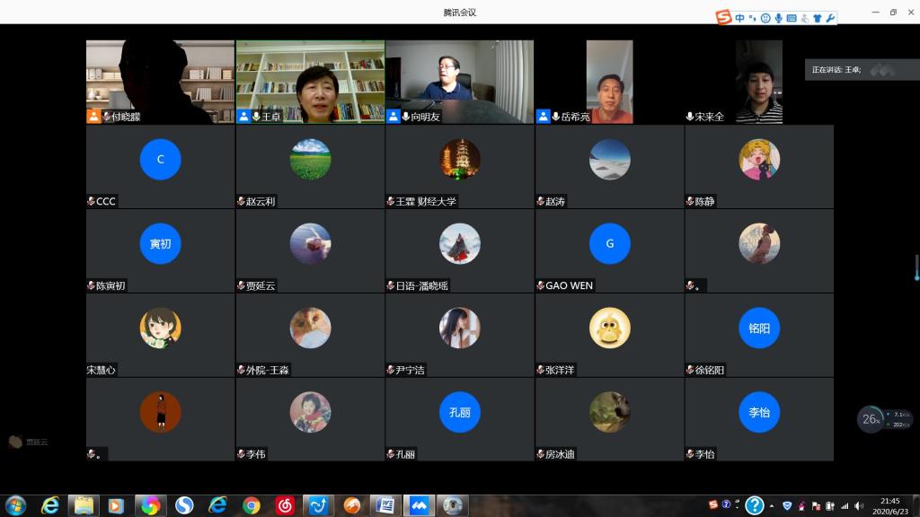 2020年6月23日晚,外国语学院联合社会科学处主办的“庆祝山东师范大学建校七十周年系列学术活动”之“社科大讲坛”第九九六讲顺利举行。对外经济贸易大学英语学院院长向明友教授应邀做客我校社科大讲坛线上讲座,作了题为“外语学科建设与专业人才培养”的讲座。本次讲座由外国语学院院长王卓教授主持,外国语学院部分教师、研究生、本科生以及外校一些对讲座感兴趣的老师、学生共同聆听了此次讲座。