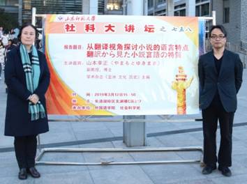 此次讲座,山本幸正副教授通过实例与分析相结合的方式,为我校师生介绍了“从翻译视角探讨小说的语言特点”。讲座内容丰富、由浅至深,问题环环相扣、引人入胜,不仅带动到场师生积极思考、回答问题,也使讲座气氛空前高涨,充满感染力。本次社科大讲坛的成功举办,有利于加深与会师生对翻译领域的认识,提高各专业学生对文学翻译方面研究的热情,对于今后中日间的学术交流起到了很好的推动作用。